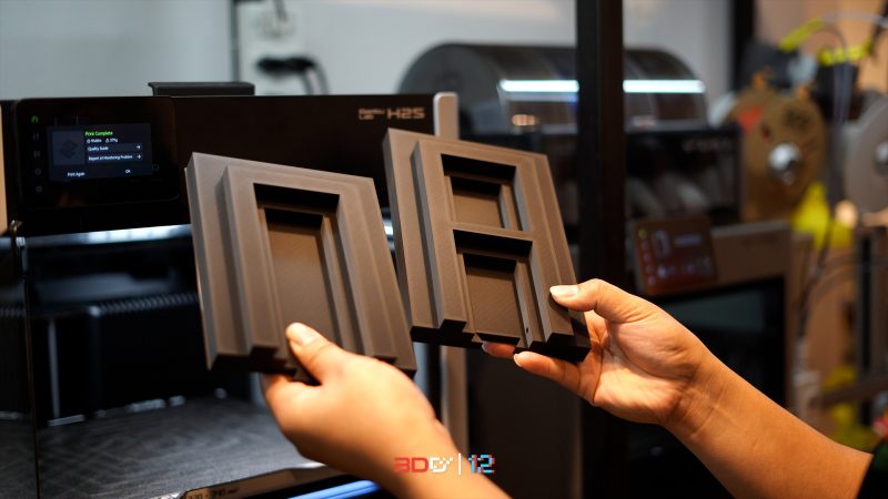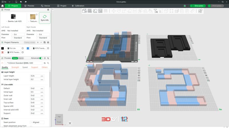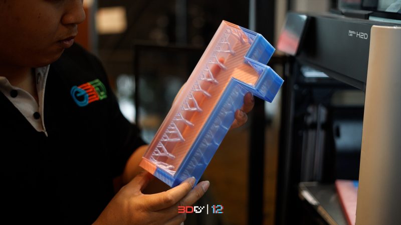 ตัวอักษรประมาณ 25 Cm หนาประมาณ 7 Cm ) ต้องแบ่งพิมพ์ทั้งหมด 4 ถาด ด้วยเครื่อง Bambu Lab H2D ที่มี 2หัวฉีด เหมาะกับโมเดลของเราที่ต้องพิมพ์ 2 สี ก็จะประหยัดเส้นและพิมพ์ได้ไวกว่าเครื่อง