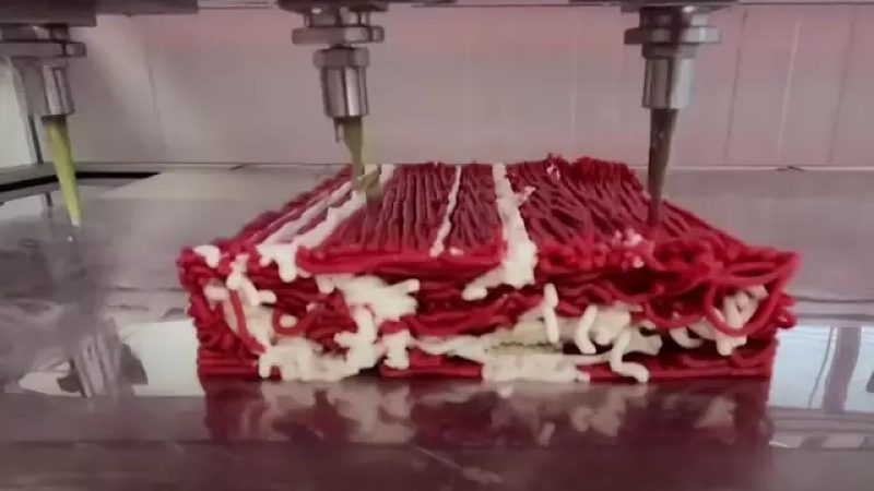 เนื้อพิมพ์ 3 มิติเป็นผลิตภัณฑ์จากสัตว์ (เช่น เนื้อวัวทำจากเซลล์กล้ามเนื้อและเซลล์ไขมันของวัว) มีกระบวนการดังนี้: