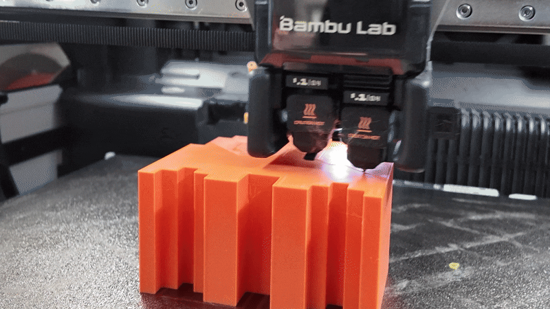 เช่น เนื้อผลสีแดงหรือส้ม และก้านสีเขียว หัวฉีดคู่ช่วยให้พิมพ์สองสีพร้อมกันได้โดยไม่ต้องเปลี่ยนเส้นหรือ purge บ่อย