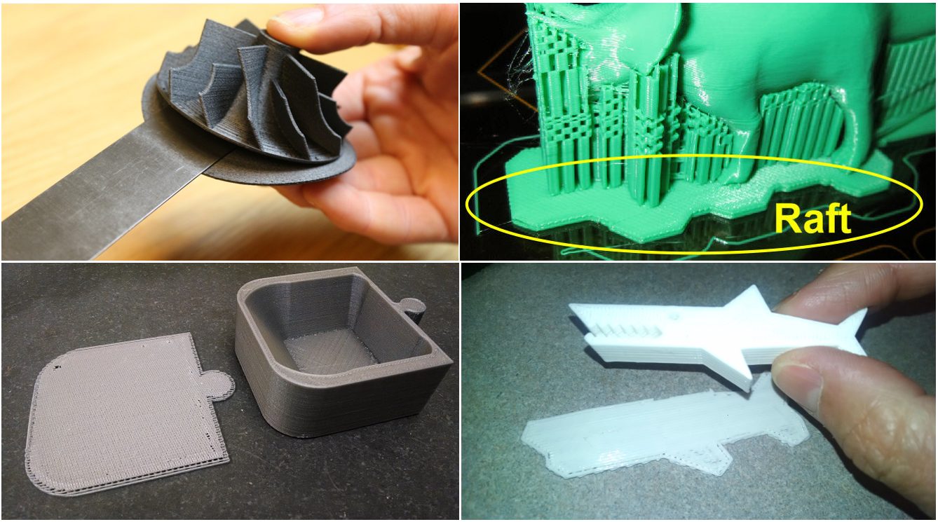 Raft : คือส่วนของแผ่นรองพื้นชิ้นงานจะเรียกว่า Raft คือแผ่นที่เอาไว้ยึดเกาะชิ้นงานกับฐานพิมพ์ โดยการเลือกใช้นั้นจะเกิดจากว่าผู้ที่ต้องการขึ้นรูปนั้นพิจรณาแล้วว่า ส่วนของชิ้นงานที่ยึดเกาะกับฐานพิมพ์นั้นค่อนข้างน้อยและมีโอกาสสุ่มเสี่ยงที่จะเกิดการล้มของชิ้นงาน จึงเลือกฟังก์ชั่นนี้ให้ชิ้นงานนั้นปลอดภัยระหว่างปริ้น จะสามารถช่วยได้