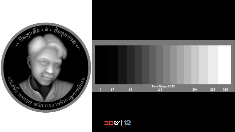 สีขาว-ดำ เลเซอร์ได้เลย แต่หากงานที่เราจะเลเซอร์เป็นงาน 3 มิติแบบที่เราทำนี้ จะไม่ใช้ไฟล์ภาพธรรมดาแต่เป็นไฟล์ภาพ Depthmap