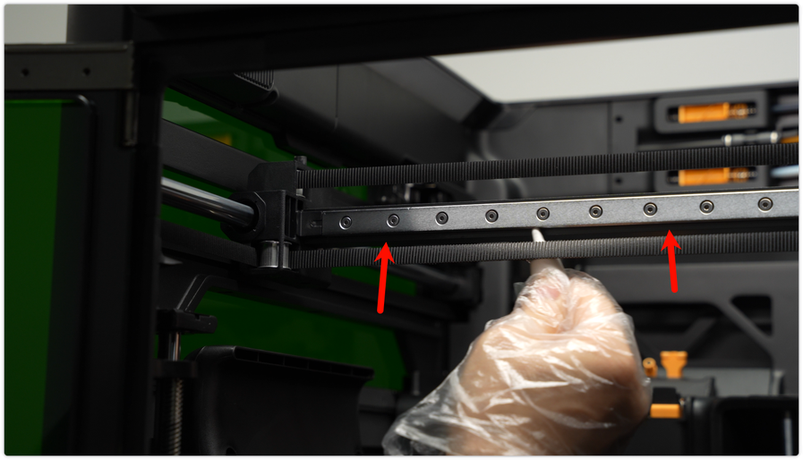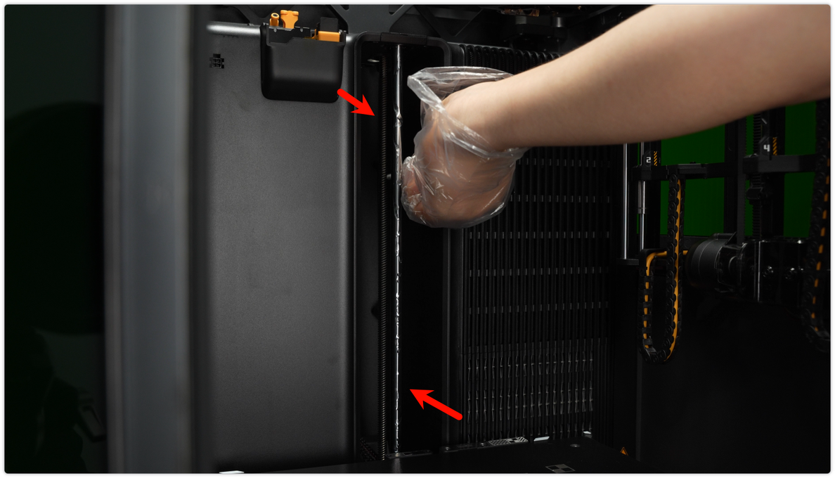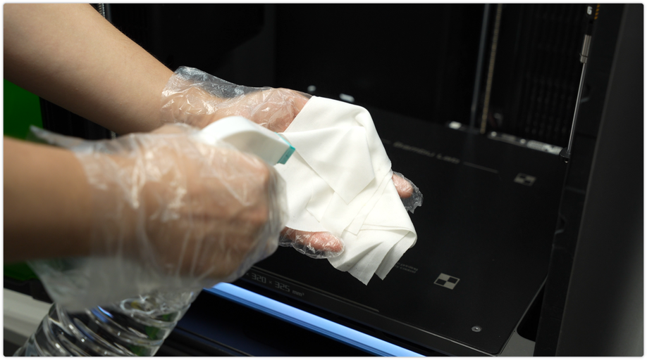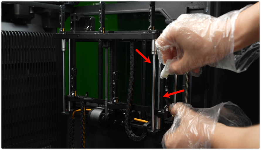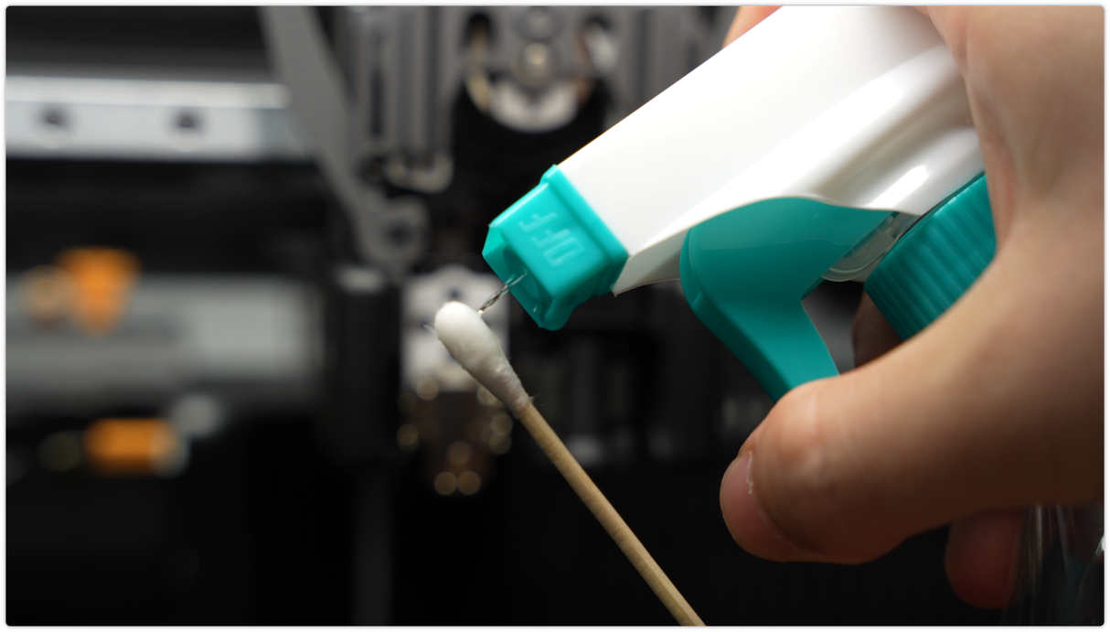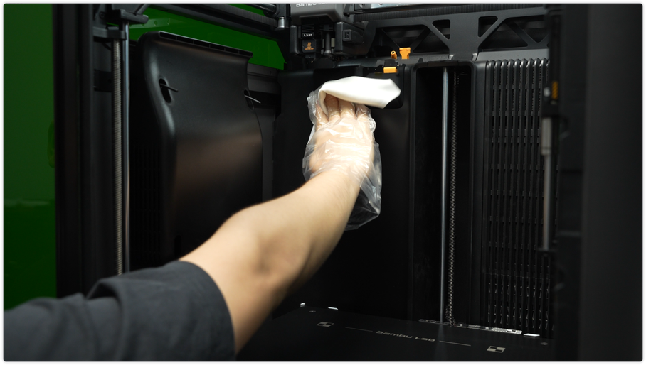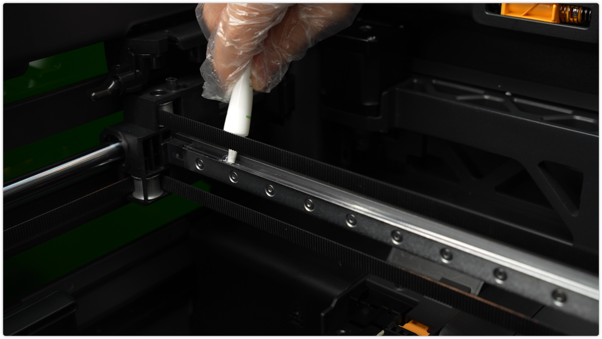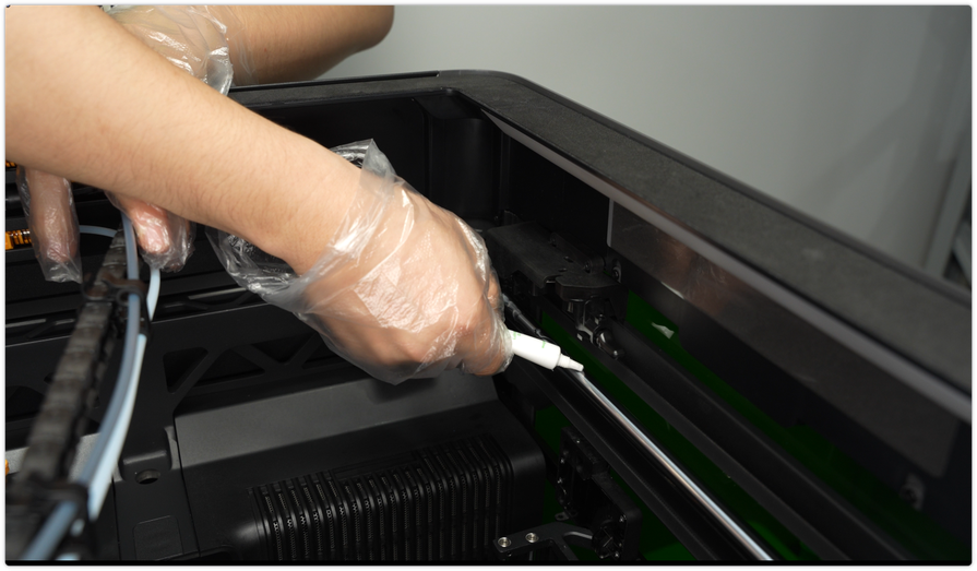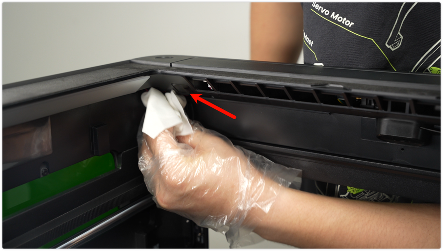 ใช้ผ้า non-woven ชุบแอลกอฮอล์เช็ดโครงเหล็กให้ทั่ว รวมถึงตัวยึดหัวฉีด และแท่งเหล็กลิเนียร์