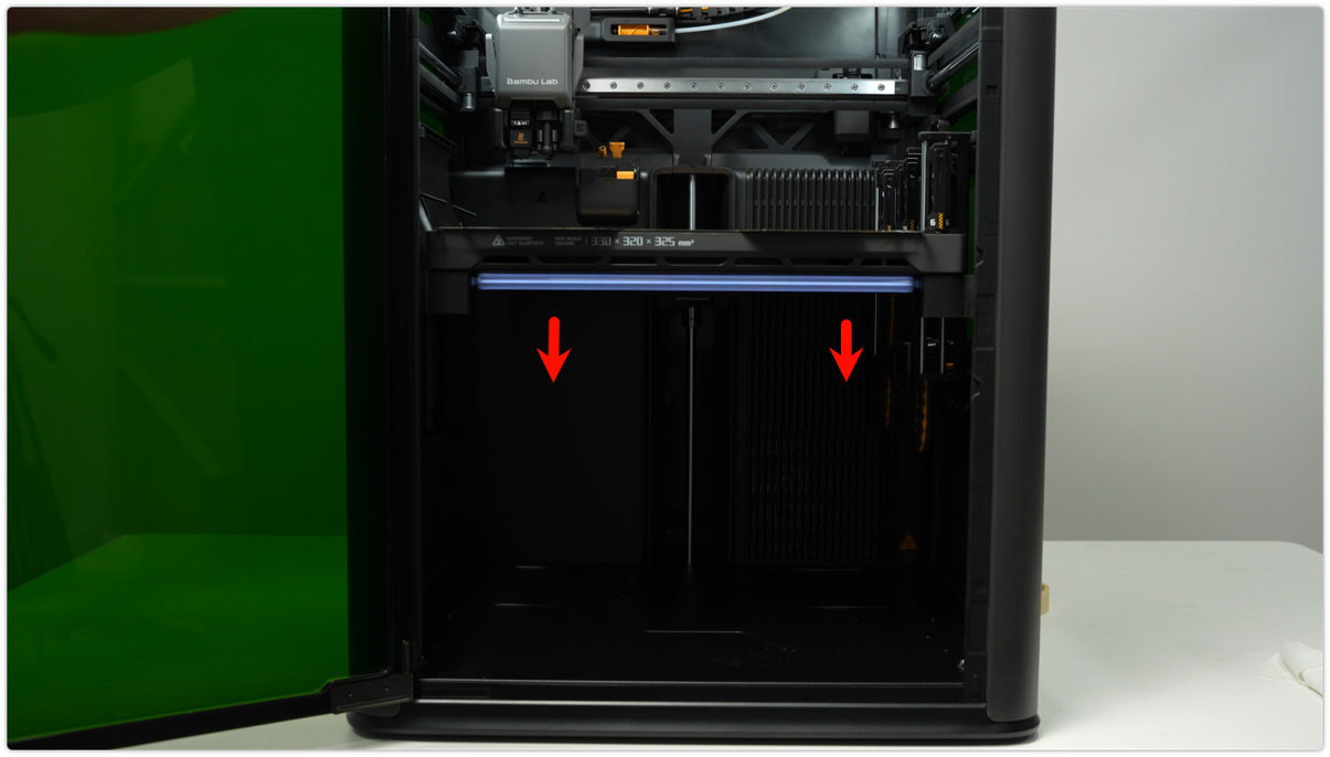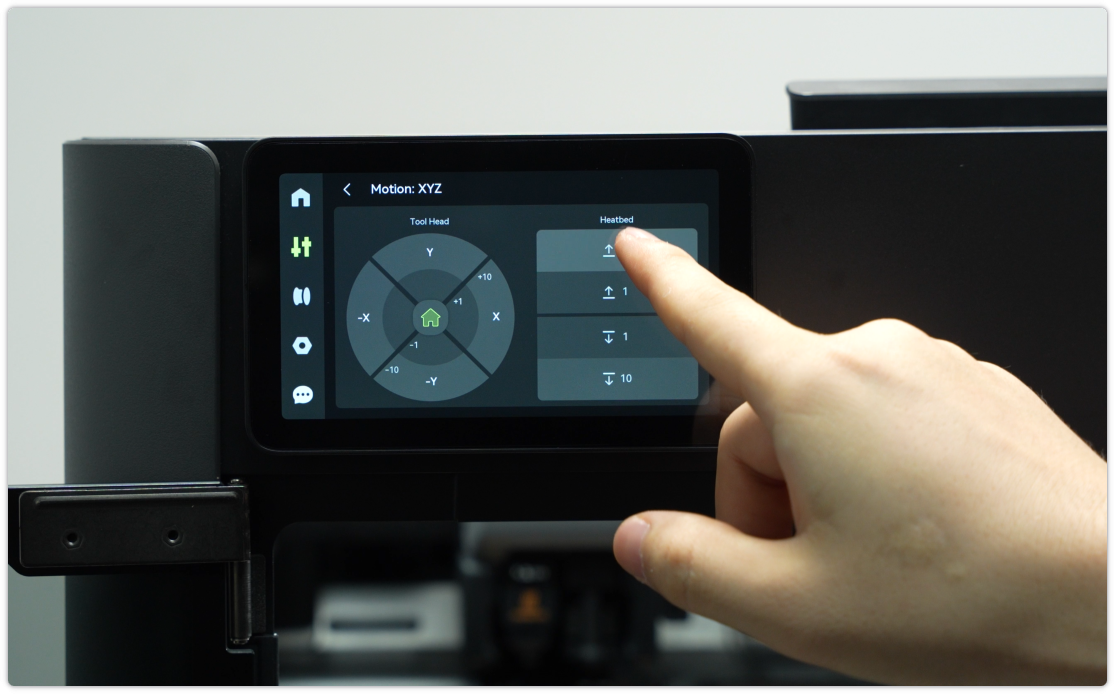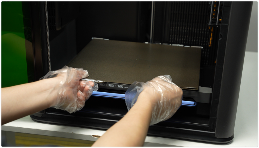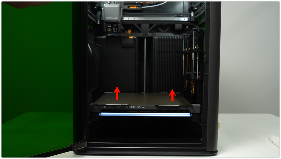 ยกแท่นพิมพ์ขึ้นโดยใช้คำสั่งในจอแสดงผล แล้วทำความสะอาดฝุ่น และเศษพลาสติกที่พื้นเครื่อง