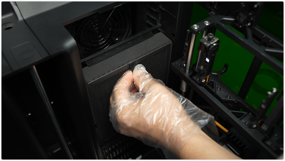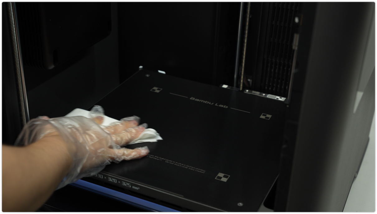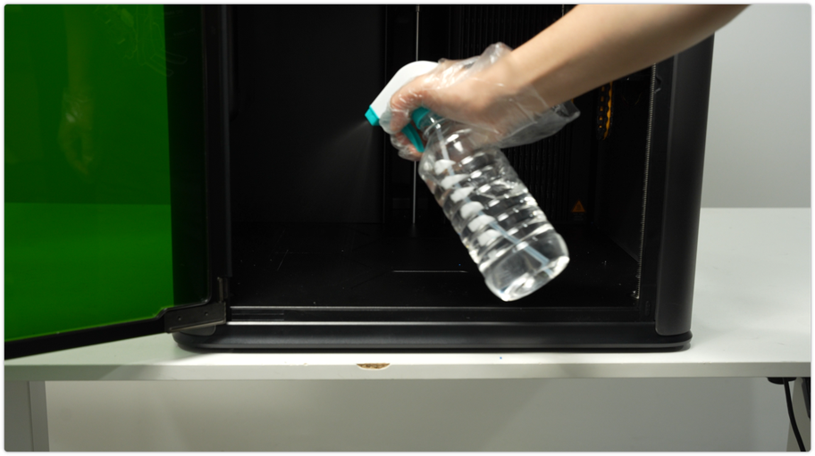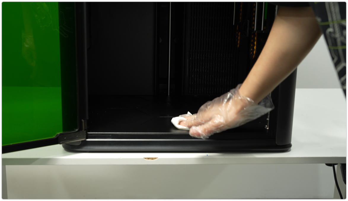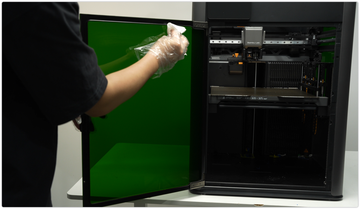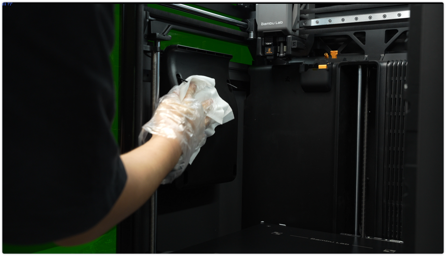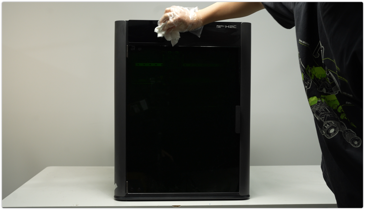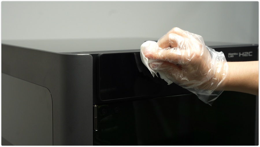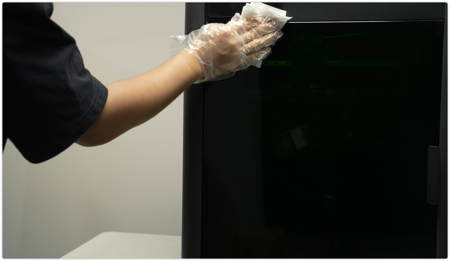 ใช้ผ้า non-woven ชุบแอลกอฮอล์เช็ดทำความสะอาดภายนอกเครื่อง โดยเฉพาะด้านข้าง ประตู และซอกมุมต่าง ๆ เพื่อกำจัดฝุ่น เศษพลาสติก และรอยนิ้วมือ