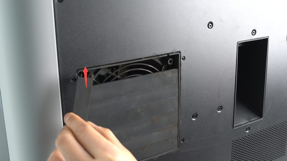 บานเกล็ดระบายอากาศอยู่ด้านหลังของเครื่องพิมพ์ จะมีอยู่เจ็ดใบ ปิดพัดลมระบายอากาศอยู่ การถอดบานเกล็ดจะถอดจากด้านบนลงล่าง ในการถอดบานเกล็ดแต่ละใบให้ดันช่วงกลางใบเข้าหาตัวเบา ๆ แล้วปลดแกนของบานเกล็ดออกจากช่องทางด้านขวา แล้วหมุนตามเข็มนาฬิกาลงมา 90 องศา แล้วยกขึ้นเล็กน้อย มันก็จะหลุดออกมา ค่อย ๆ นำออกมาจากเครื่องจากนั้นนำใบบานเกล็ดที่เหลือออกมาจนหมด