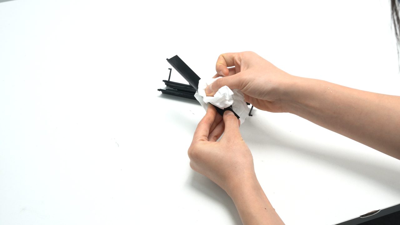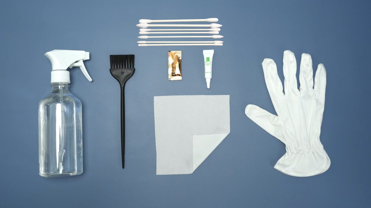 เริ่มจากทำความสะอาดโดยใช้แปรงปัดฝุ่นออก แล้วเช็ดด้วยผ้า non-woven ชุบแอลกอฮอล์