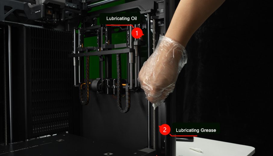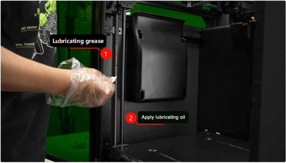 เมื่อเสร็จแล้วให้ใช้คำสั่งในหน้าจอ เลื่อนแท่นพิมพ์ขึ้น-ลงจนสุด 3-4 ครั้งเพื่อให้น้ำมันกระจายตัวได้ทั่วถึง เสร็จแล้วก็เช็ดน้ำมันและจารบีส่วนเกินออกไป