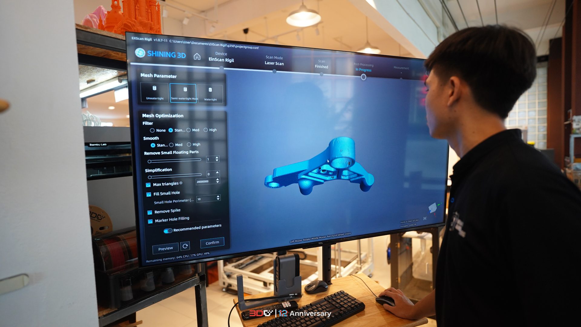 เครื่องสแกนที่เราเลือกใช้มาสแกนในครั้งนี้คือ EinScan Rigil เป็นเครื่องสแกนเนอร์รุ่นใหม่ล่าสุดของ Shinning3D ที่โดดเด่นมากในเรื่อง Standalone เป็น Mode มีหน้าจอและหน่วยประมวล(CPU+GPU) อยู่ในตัวเลย ทำให้สามารถทำงานจบในตัวเองได้เลย ไม่ต้องมานั่งต่อสายกับเครื่องคอมพิวเตอร์ให้วุ่นวาย แถมมี Cross Laser Scan 19+19 Laser Line ครอสบลูเลเซอร์จำนวน 38เส้น ทำให้สแกนชิ้นงานได้รวดเร็วมาก มีระบบ NIR – Rapid Infrared scan ที่ใช้แสงอินฟราเรดในการ Scan เก็บข้อมูล ระบบนี้ไม่ต้องติด Marker และ ให้ Parallel มาถึง 7Laser Line ครอบคลุมการสแกน เก็บทุกรายละเอียดได้หมด
