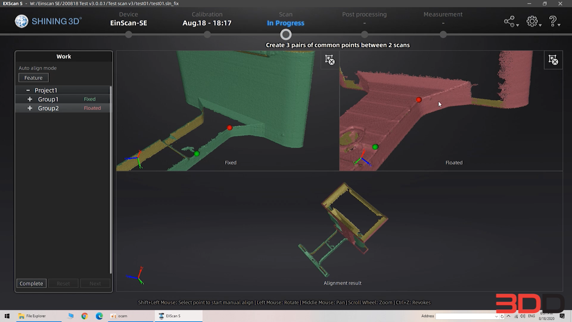 หากการสแกนงานนั้นสมบูรณ์การเชื่อมต่อถูกต้องโปรแกรมก็จะทำการต่อชิ้นงานได้อย่างถูกต้องจึงไม่จำเป็นต้องใช้งานการทำAlgin แต่หากว่างานไม่สมบูรณ์ก็จะทำการต่อชิ้นงานด้วยมือโดยการเลือกจุด3จุดที่เหมือนกัน ในการเลือกจุด3จุดนั้นให้เลือกจุดที่เป็นตำแหน่งที่เหมือนกันที่ชิ้นงานทั้งสองชิ้น หากการเลือกไม่ตรงก็จะทำให้การต่อไม่สมบูรณ์สามารถยกเลิกและแก้ไขได้เรื่อยๆ ถ้าเลือกถูกต้องทั้ง3จุดโปรแกรมก็จะประมวณผลได้อัตโนมัติอย่างแม่นยำ ดังนั้นจึงไม่จำเป็นต้องจุดให้ตรงเป๊ะๆ แค่ใกล้เคียงที่สุดก็เพียงพอแล้ว