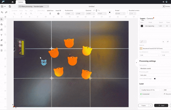 การควบคุมการทำงานกับเครื่องเลเซอร์ทั้ง 2 รุ่นหลักๆเลยจะทำงานด้วยการเชื่อมต่อกับคอมพิวเตอร์ผ่านโปรแกรม Falcon Design Space ของ Creality เลย ซึ่งทั้ง 2 รุ่นสามารถจัดวางตำแหน่ง