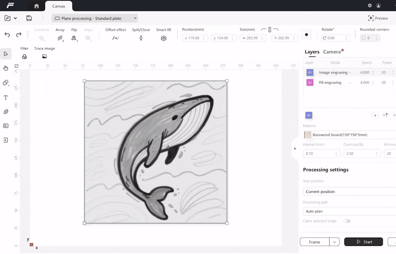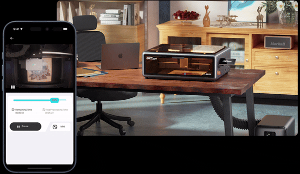 ผ่าน Account ของ Creality ในการสร้างไฟล์ จัดวางตำแหน่งและส่งมาที่ตัวเครื่องเพื่อสั่งเลเซอร์อีกทั้งยังสามารถดูการทำงานผ่านมือถือได้แบบ Real-time อีกด้วย (ต่อ Wi-Fi วงเดียวกับเครื่อง)