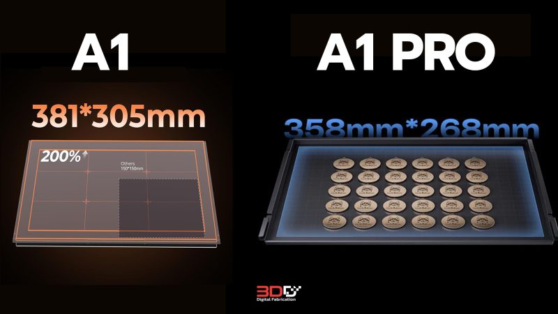 กว้างยาวเท่ากันแต่ A1 Pro จะสูงกว่าเล็กน้อย แต่เมื่อมาดูที่เครื่องจริงเมื่อมองเผินๆ แทบแยกกันไม่ออกเลย ในส่วนของน้ำหนัก A1 Pro จะหนักกว่าประมาณ 1 Kg โดยในส่วนนี้ไม่ได้มีความแตกต่าง