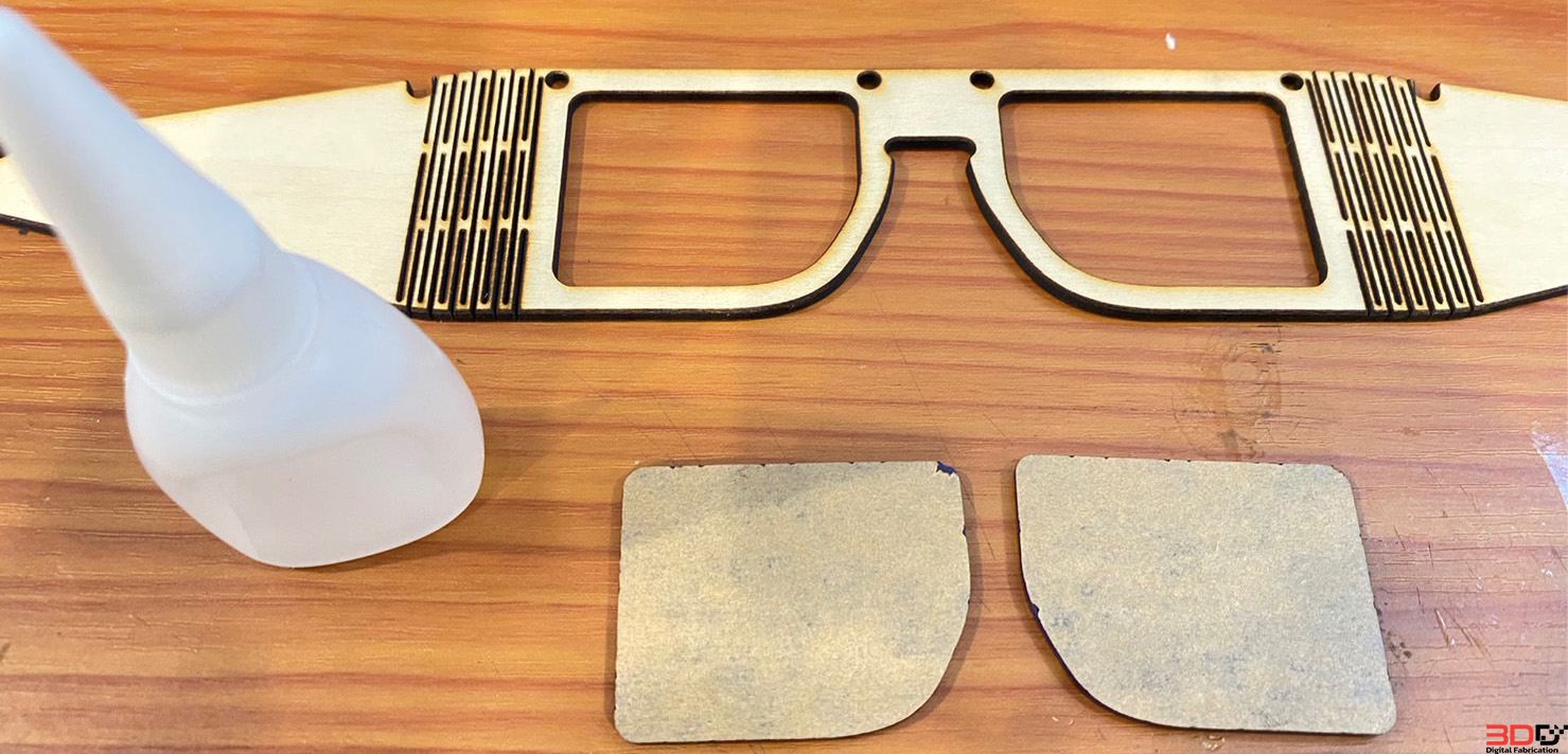 - นำชิ้นงานที่ได้แล้ว คือ กรอบแว่นตา และ เลนส์ มาเตรียมพร้อม โดยมีอุปกรณ์ คือ กาวร้อน เพื่อใช้ติดเลนส์เข้ากับกรอบแว่นครับ