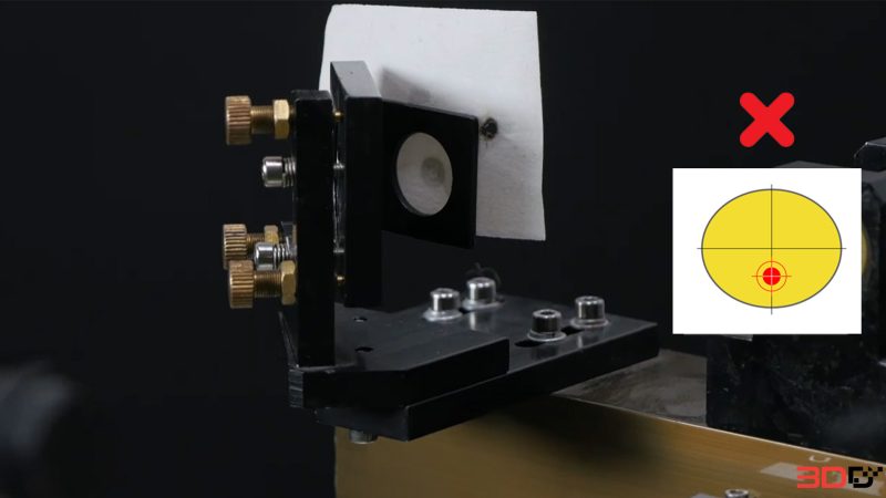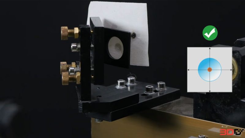 เราต้องกดเทสยิงแล้วสังเกตุ ดูว่าแสงที่ออกมาเข้าจุดตรงกลางของวงกลมไหม ถ้าเกิดไม่เข้าตรงกลางจะทำให้กำลังที่ตัดไม่มีประสิทธิภาพ และเราต้องปรับให้ตรงทั้ง 4 จุด ของตำแหน่งเครื่อง Laser มุมซ้ายมุมขวาบน มุมซ้ายล่างมุมขวาล่าง อย่างละเอียดถ้าไม่เข้าใจดูรูปด้านล่างได้เลยครับ
