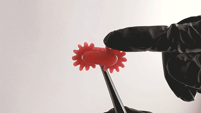 ทีมวิจัยได้ฉายแสงทั้งสองชนิดพร้อมกันเพื่อสร้างชิ้นงานที่แข็งแรงคู่ไปกับโครงสร้างรองรับ แทนที่จะต้องมานั่งแกะส่วนเกินออก พวกเขาเพียงแค่นำชิ้นงานไปแช่ในสารละลายเพื่อละลายโครงสร้างรองรับออก เผยให้เห็นชิ้นงานที่พิมพ์ด้วยแสง UV อย่างสมบูรณ์