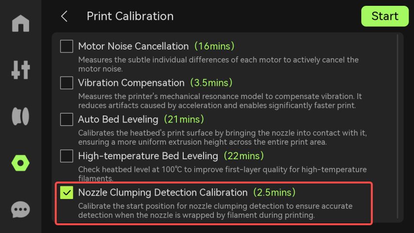 เริ่มทำการคาลิเบรท: ให้ไปที่จอภาพของเครื่องพิมพ์ แล้วเลือกคำสั่ง Settings > Calibration > Printing Calibration > Nozzle Clumping Detection Calibration