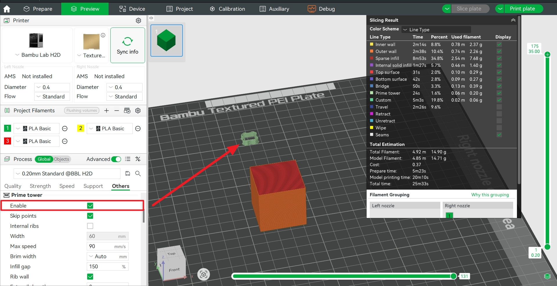 เนื่องจาก เส้นพลาสติกอาจไหลย้อยออกมาจากหัวฉีดระหว่างการตรวจสอบ ดังนั้นระบบจะสร้าง Prime Tower ให้โดยอัตโนมัติเพื่อเป็นที่ดักเศษวัสดุ