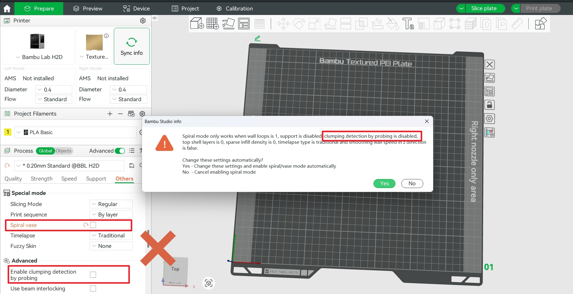 เมื่อเปิดใช้งาน Spiral Vase หรือการพิมพ์โหมดแจกัน การตรวจสอบจะถูกปิดโดยอัตโนมัติ
