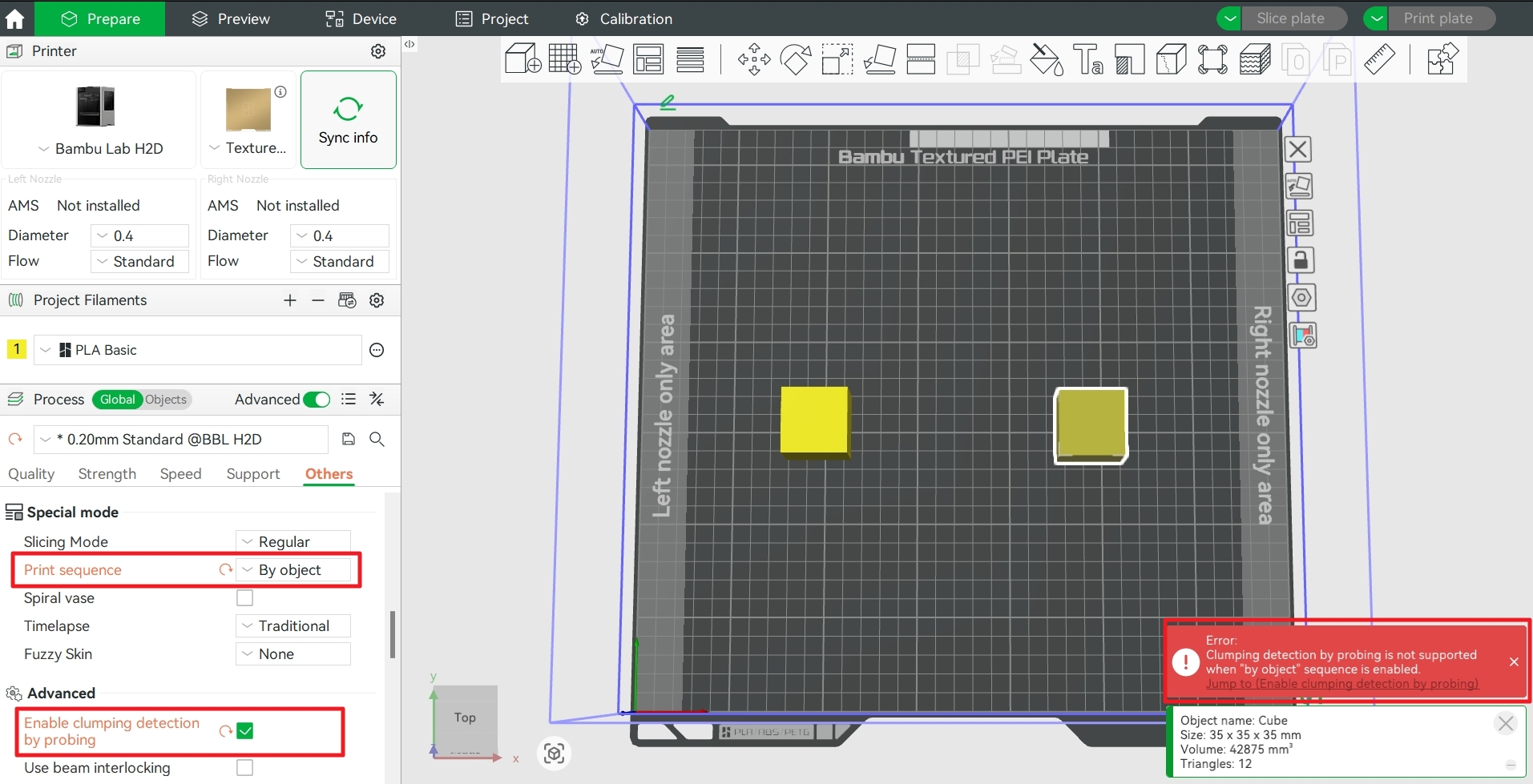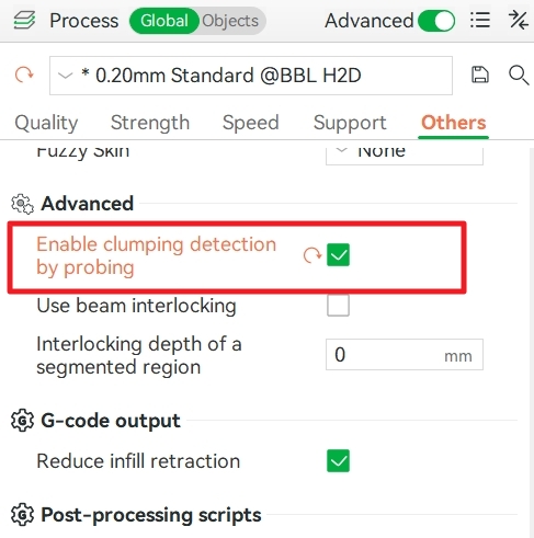 การเปิด-ปิดการใช้งานที่คำสั่ง “Enable clumping detection by probing” ใน Bambu Studio → Process → Global → Others → Advanced ซึ่งคำสั่งนี้จะต้องเปิด-ปิดโดยผู้ใช้งานเอง