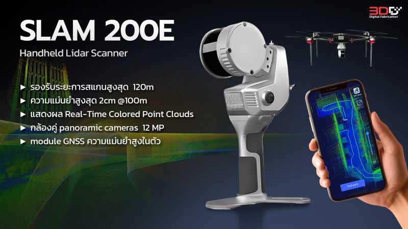 สำหรับเจ้าตัว Slam 200E เครื่องสแกนรุ่นอัพเกรดจาก Slam100 เป็นเครื่องสแกนความเม่นยำสูง (2cm @100M) ใช้สำหรับสแกนสำรวจพื้นที่ มีระยะสแกนสูงสุด 120 ม. รัศมีการสแกน 360°