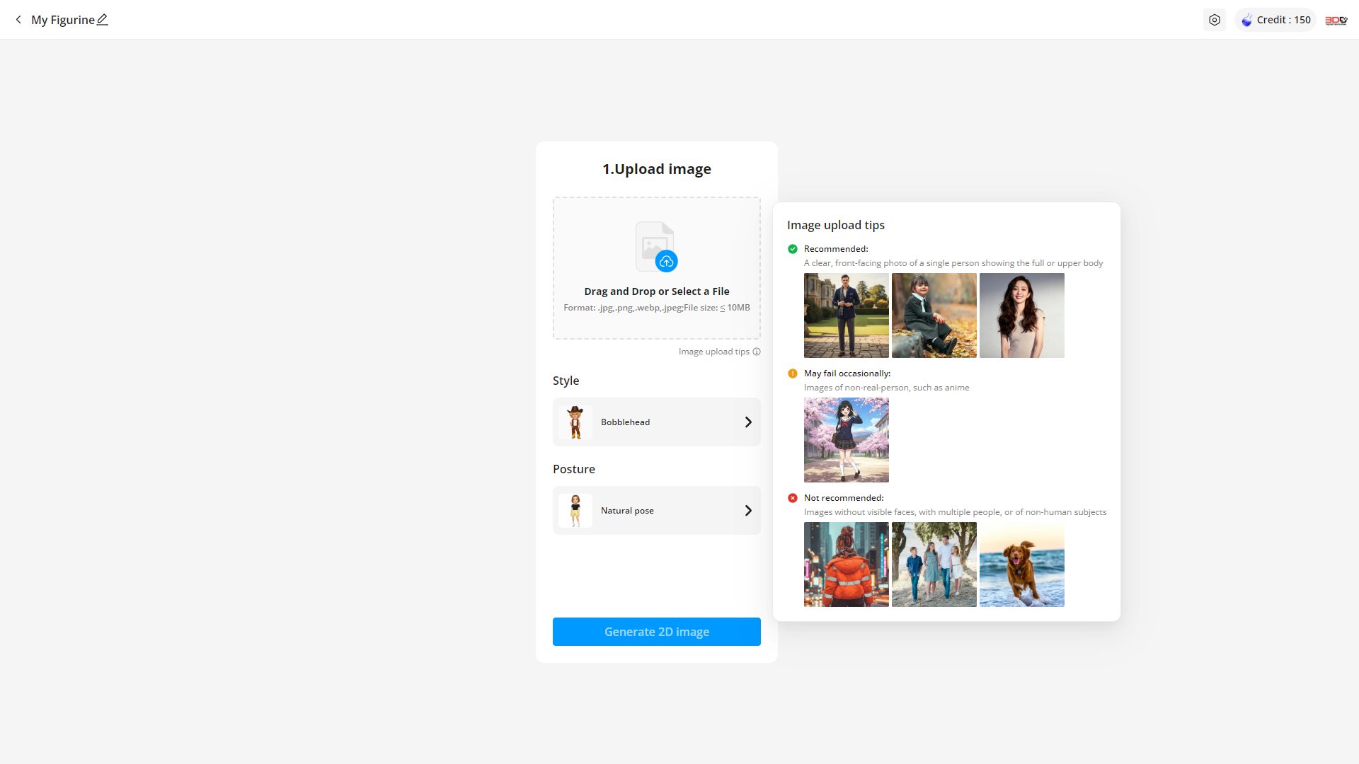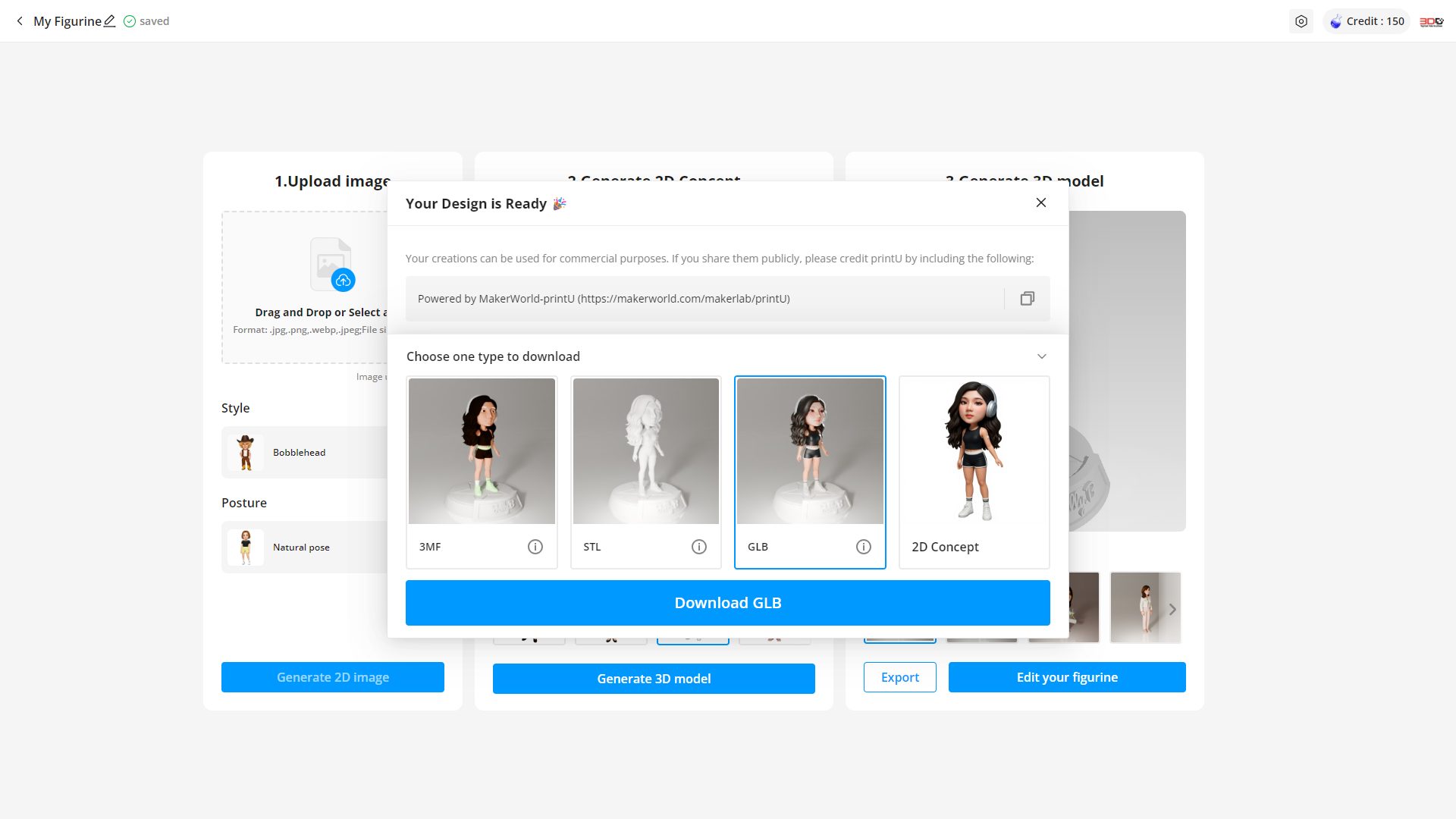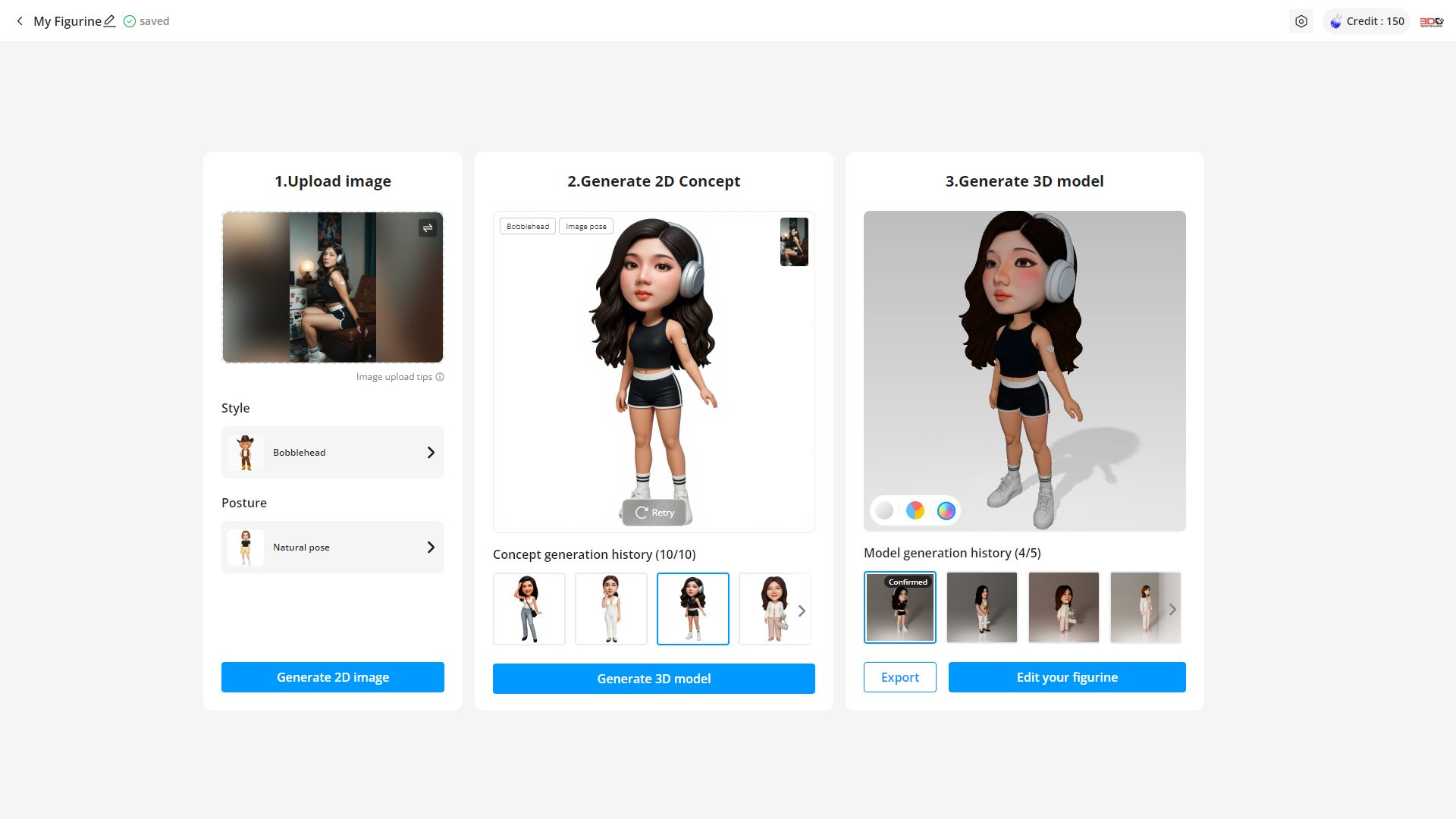 เมื่อได้รูปที่ต้องการแล้วก็กดปุ่ม “Generate 3D model” อันนี้จะรอนานหน่อย แล้วก็จะได้โมเดลสามมิติ สามารถกดปุ่ม “Generate 3D model”ได้อีกถ้ายังไม่พอใจ และยังสามารถเลือกดูได้ว่าจะแสดงเป็นสีเดียว หลายสี หรือสีธรรมชาติ และหากยังต้องการแต่งต่อก็สามารถกดปุ่ม”Edit your figurine”