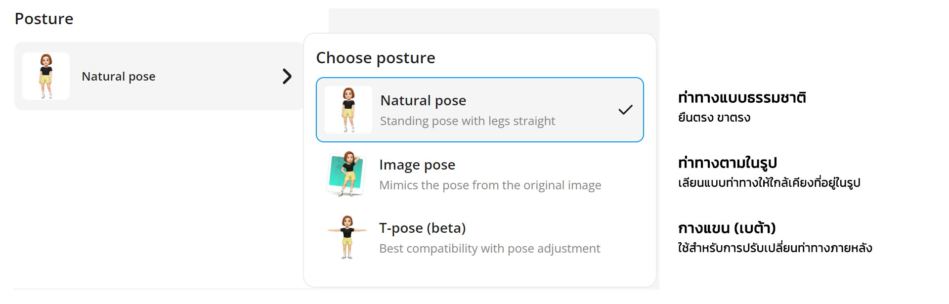 นอกจาก Style แล้วก็ยังมี Posture ให้เลือกด้วย มีอยู่ 3 แบบ