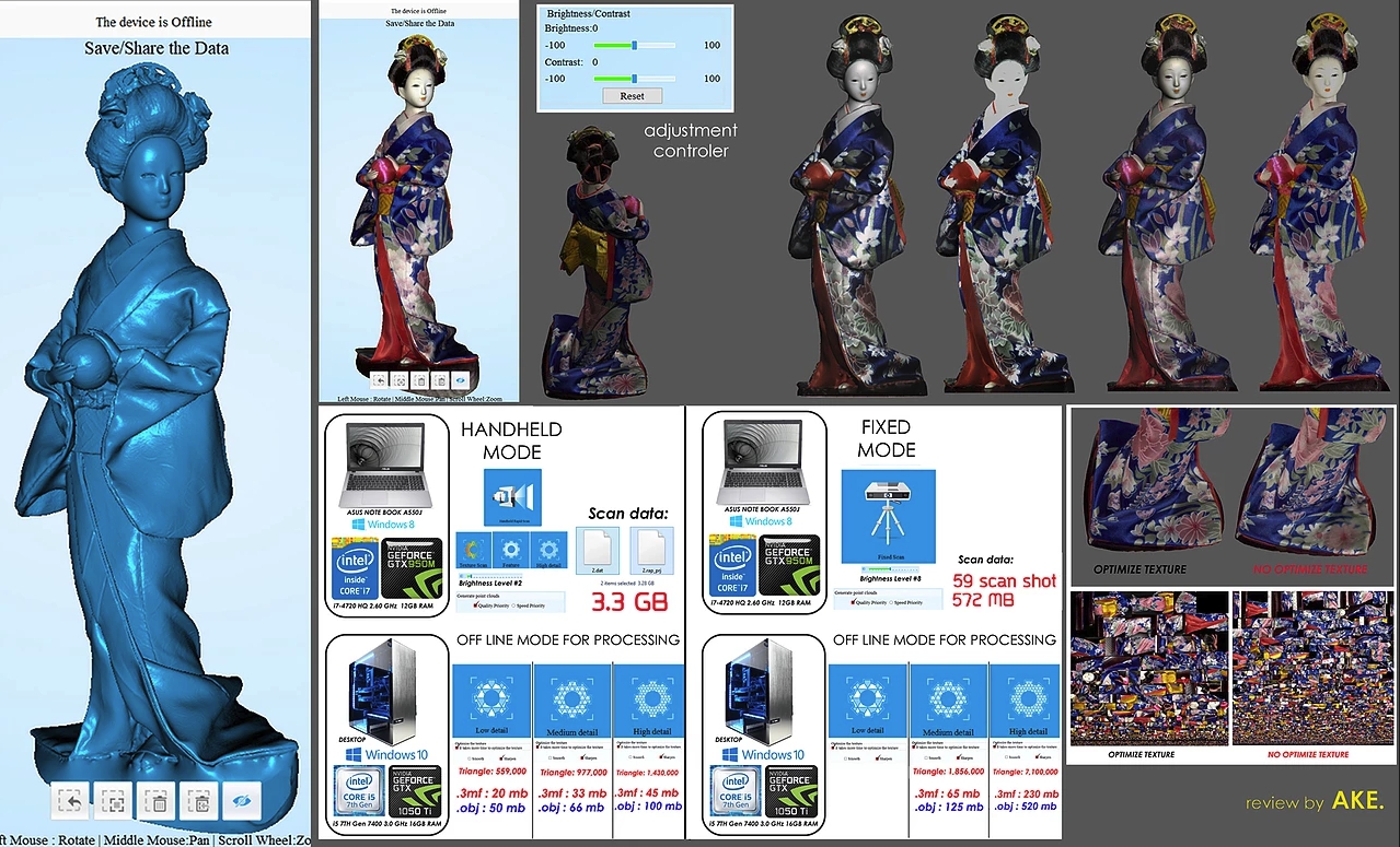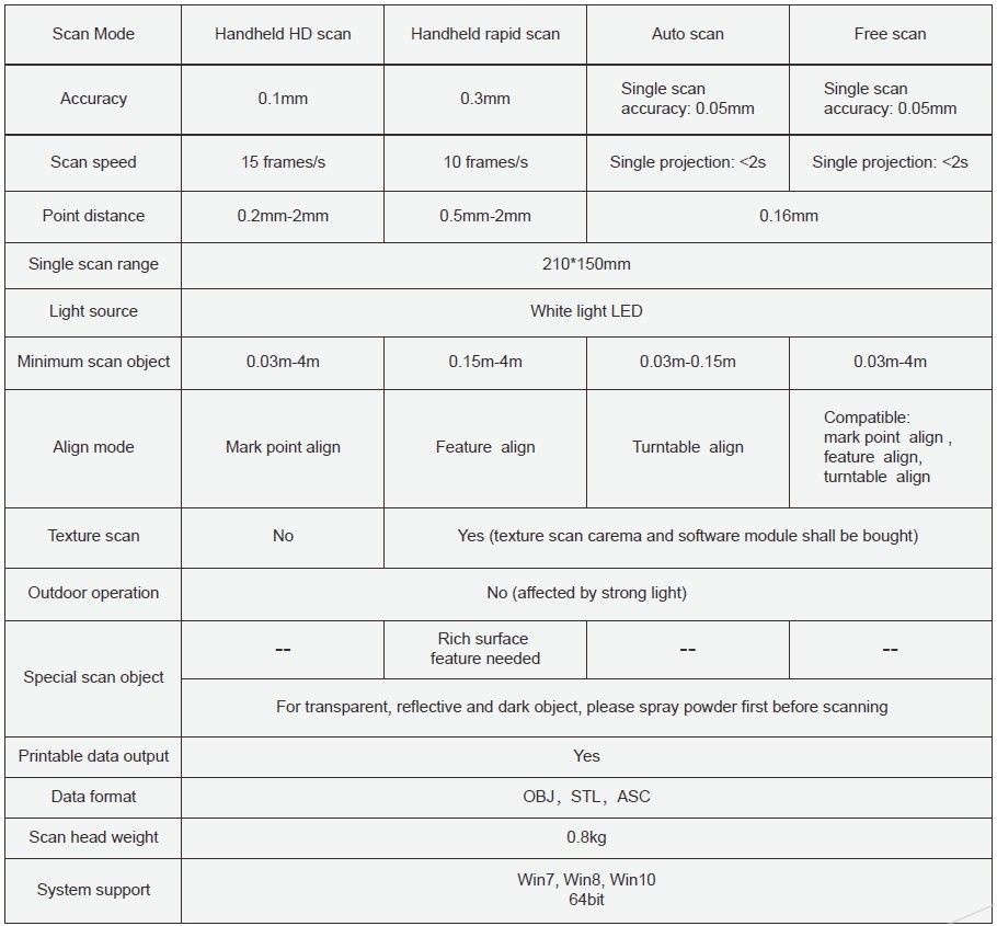 1. ระบบมือถือสแกนรอบชิ้นงานหรือ Handheld HD Scan เป็นการสแกนที่ความละเอียด 100 Micron (0.1mm) ทำได้โดยการเตรียมวัตถุ โดยติดสติกเกอร์ Marker เพื่อกำหนด Reference โดยผู้ใช้สามารถเดินรอบชิ้นงานที่ต้องการสแกนได้เลย โหมดนี้เหมือนกับการสแกนที่ต้องการคุณภาพสูง วัตถุอยู่นิ่ง ไม่เหมาะกับสิ่งมีชีวิต เช่น การสแกนรูปปั้นนอกสถานที่ วัตถุทางศิลปะ ชิ้นส่วนทางวิศกรรมที่ไม่สามารถถอดออกเป็นชิ้น ๆ ได้