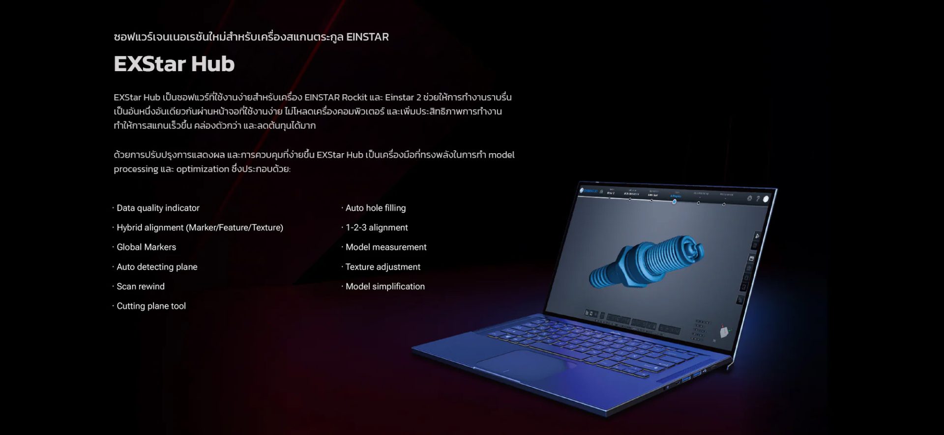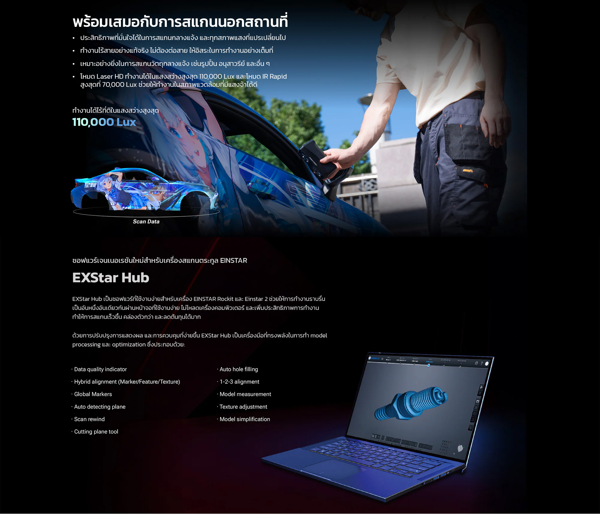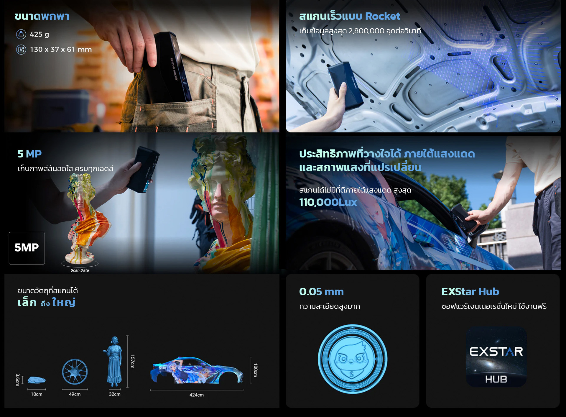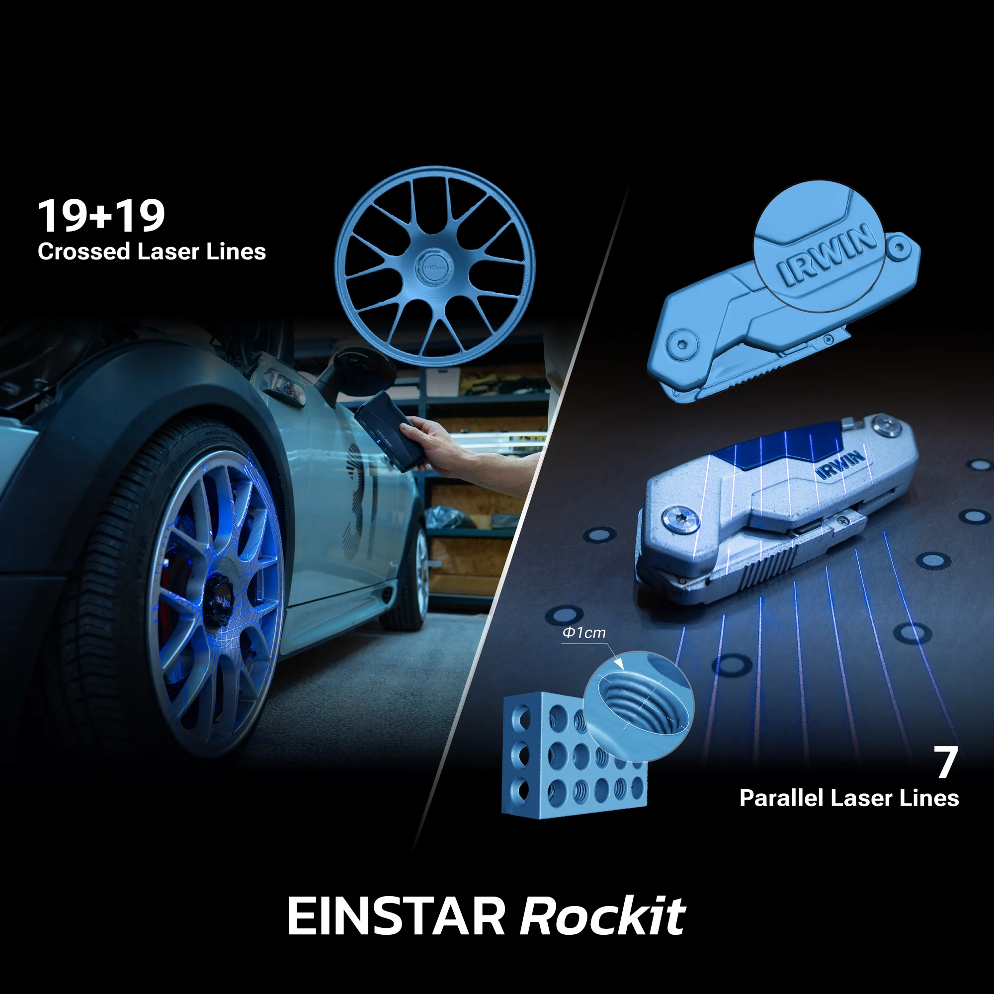 - EINSTAR Rockit คือเครื่องสแกน 3 มิติแบบพกพาประสิทธิภาพสูง เหมาะสำหรับผู้ใช้งาน เช่น นักออกแบบผลิตภัณฑ์ วิศวกรยานยนต์ ศิลปิน 3 มิติ และนักประดิษฐ์ ใช้ในการสแกนชิ้นส่วนยานยนต์ การสร้างสรรค์งานศิลปะดิจิทัล การผลิตเนื้อหา AR/VR และการสแกนวัตถุที่อยู่กลางแจ้ง เช่น รูปปั้นและประติมากรรม