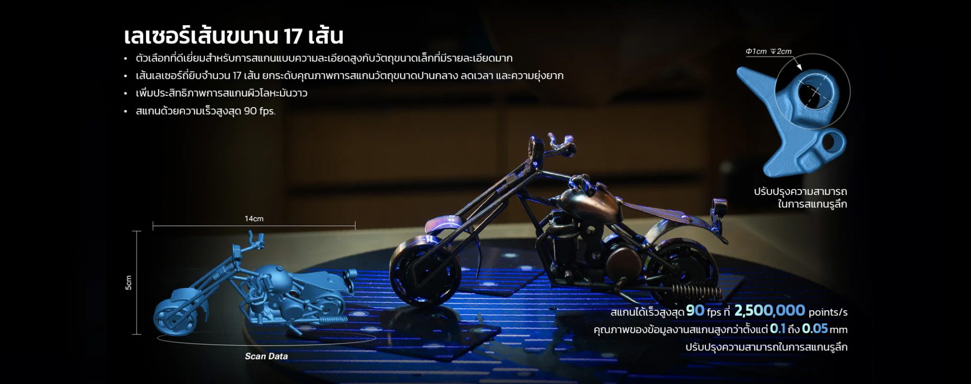 - เส้นเลเซอร์ขนาน 17 เส้น เป็นอีกหนึ่งนวัตกรรมจาก SHINING 3D ที่สร้างสมดุลระหว่างความเร็ว และรายละเอียดได้อย่างลงตัว เมื่อเทียบกับรูปแบบ 7 เส้น เลเซอร์นี้เพียงพอที่จะสามารถบันทึกรายละเอียดได้อย่างมีคุณภาพ พร้อมทั้งขยายช่วงการสแกนที่มีประสิทธิภาพให้ครอบคลุมวัตถุขนาดกลาง ทำให้การสแกนเสร็จสิ้นได้รวดเร็วยิ่งขึ้น การออกแบบนี้ถือเป็นทางเลือกที่คุ้มค่าสำหรับเลเซอร์เส้นขนาน และเส้นตาราง สรุปแล้ว EINSTAR 2 สามารถสแกนได้หลากหลายรูปแบบ เทียบเท่ากับสแกนเนอร์ที่ติดตั้งชุดเลเซอร์หลายชุด