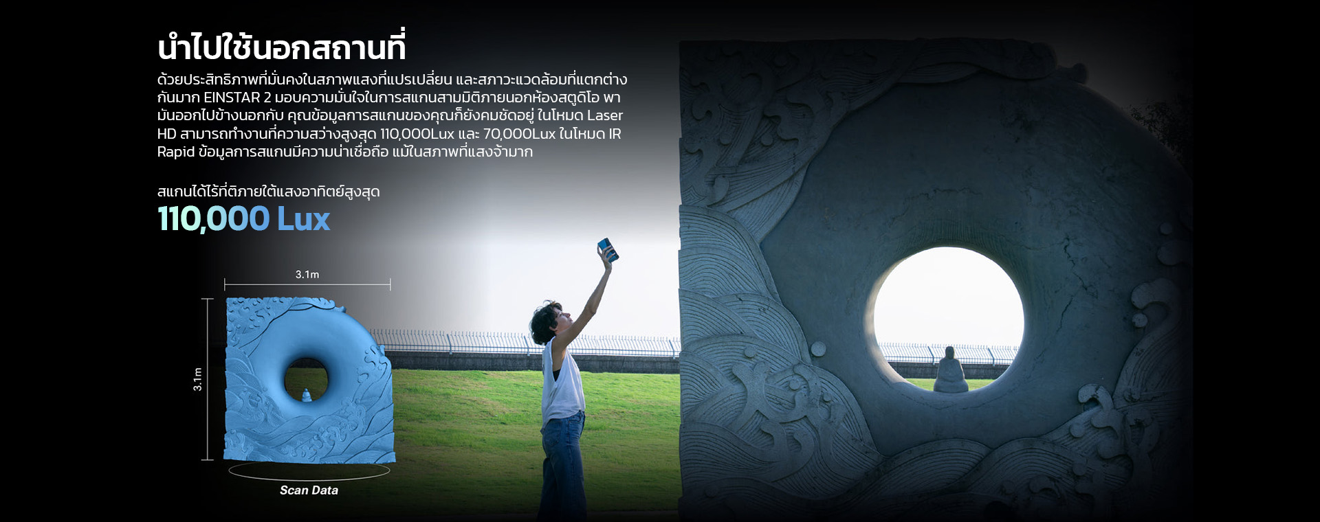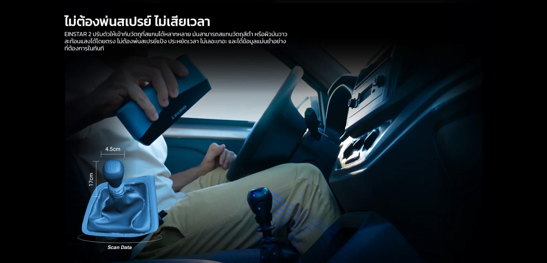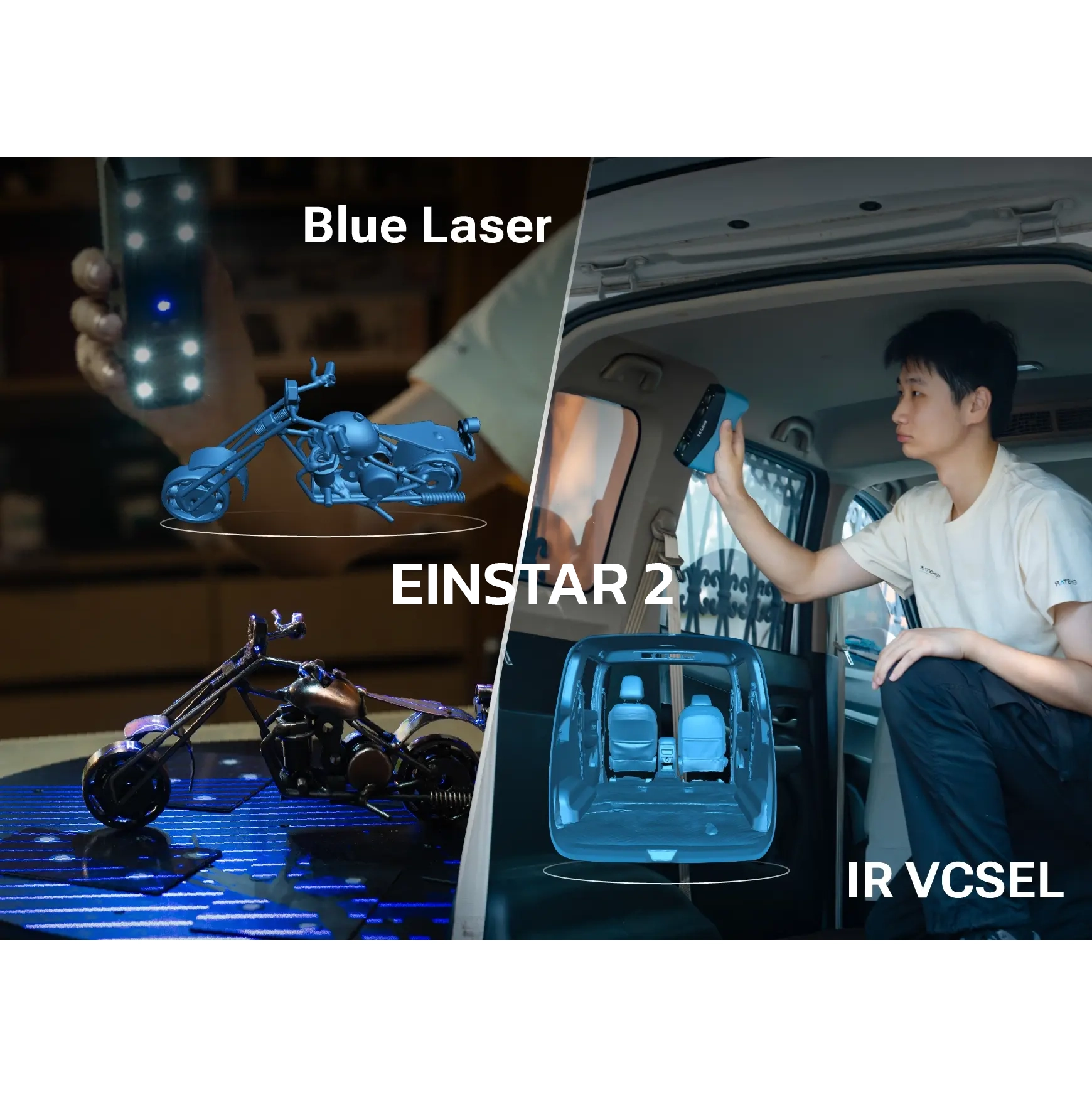 - ตั้งแต่วัตถุที่มีรายละเอียดเล็กๆ (5 มม.) ไปจนถึงวัตถุขนาดใหญ่ (10 ม.) EINSTAR 2 ก็สามารถรองรับได้ สามารถสลับโหมดการทำงานได้สองโหมด ได้แก่ โหมดเลเซอร์สำหรับวัตถุขนาดเล็กถึงขนาดกลาง และโหมดอินฟราเรดสำหรับวัตถุขนาดใหญ่ และมีพื้นที่กว้าง ความยืดหยุ่นนี้ช่วยให้สามารถจัดการกับวัสดุได้หลากหลาย เช่น วัตถุสีดำ หรือมีพื้นผิวสะท้อนแสง