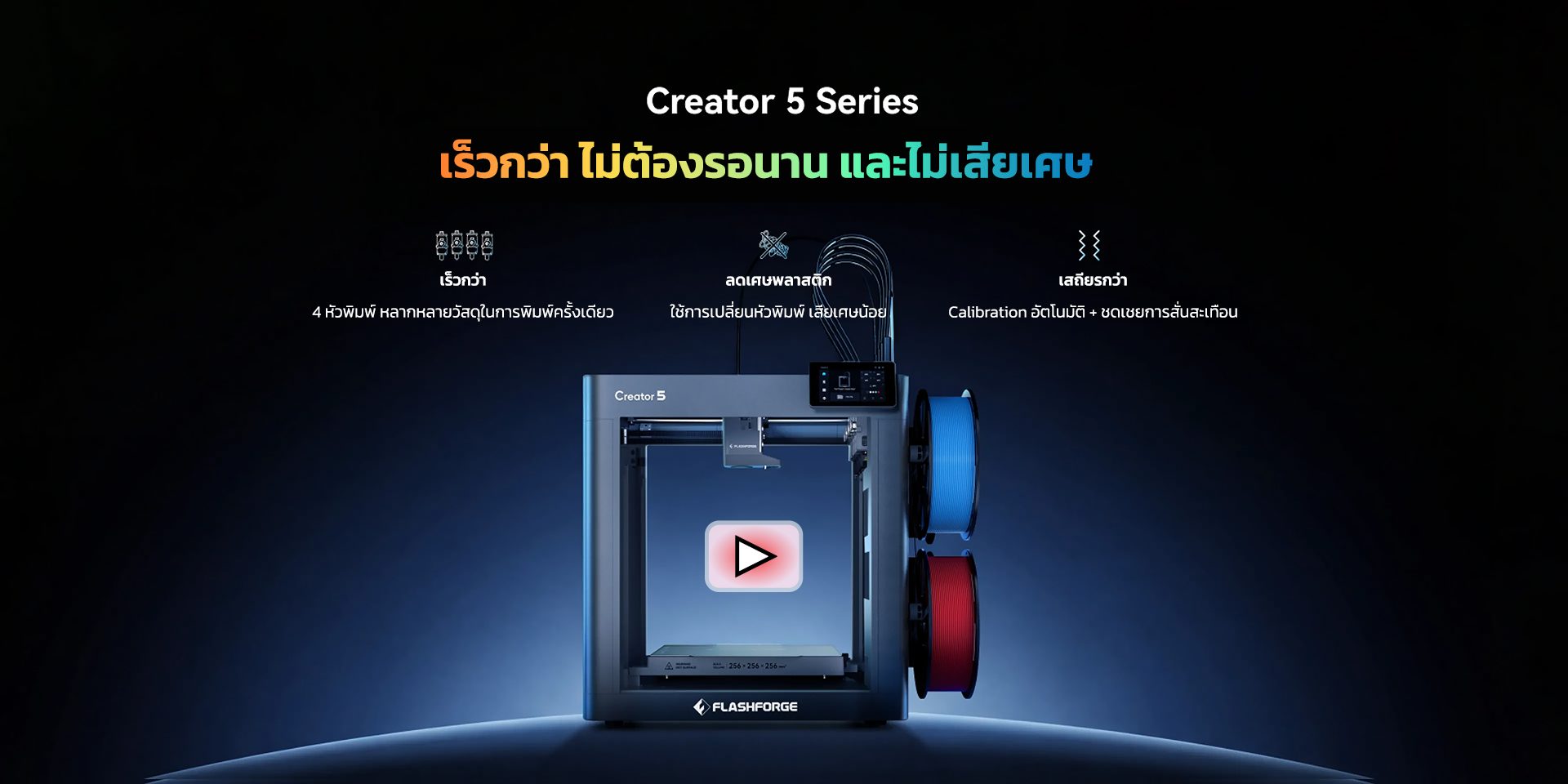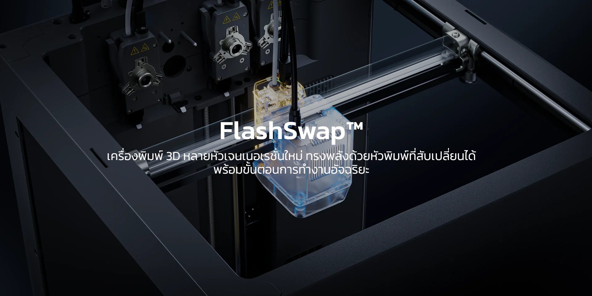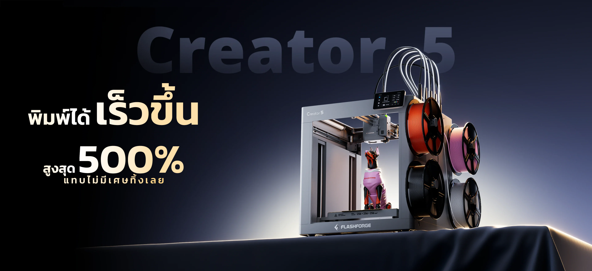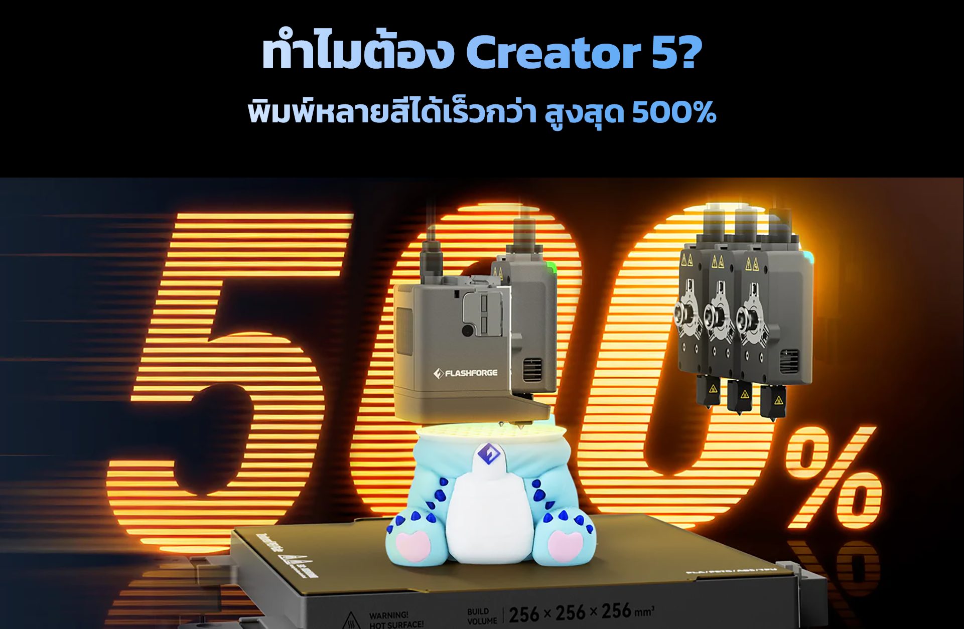 Flashforge Creator 5 Pro เป็นเครื่องพิมพ์ 3 มิติความเร็วสูง 4 หัวพิมพ์ ที่มาพร้อม ระบบเปลี่ยนหัวพิมพ์ FlashSwapTM ออกแบบมาสำหรับการพิมพ์หลายสี และหลายวัสดุโดยมีเศษพลาสติกเกือบเป็นศูนย์ แตกต่างจากระบบแบบ AMS ที่ใช้หัวฉีดร่วมกันเพียงหัวเดียว ทำให้ต้องฉีดพลาสติกทิ้งเป็นจำนวนมาก ระบบเปลี่ยนหัวพิมพ์ที่แท้จริงนี้ มีหัวพิมพ์อิสระสี่หัวทำให้ไม่ต้องเสียเนื้อที่สำหรับช่องขนาดใหญ่เพื่อทิ้งเศษพลาสติกอีกด้วย