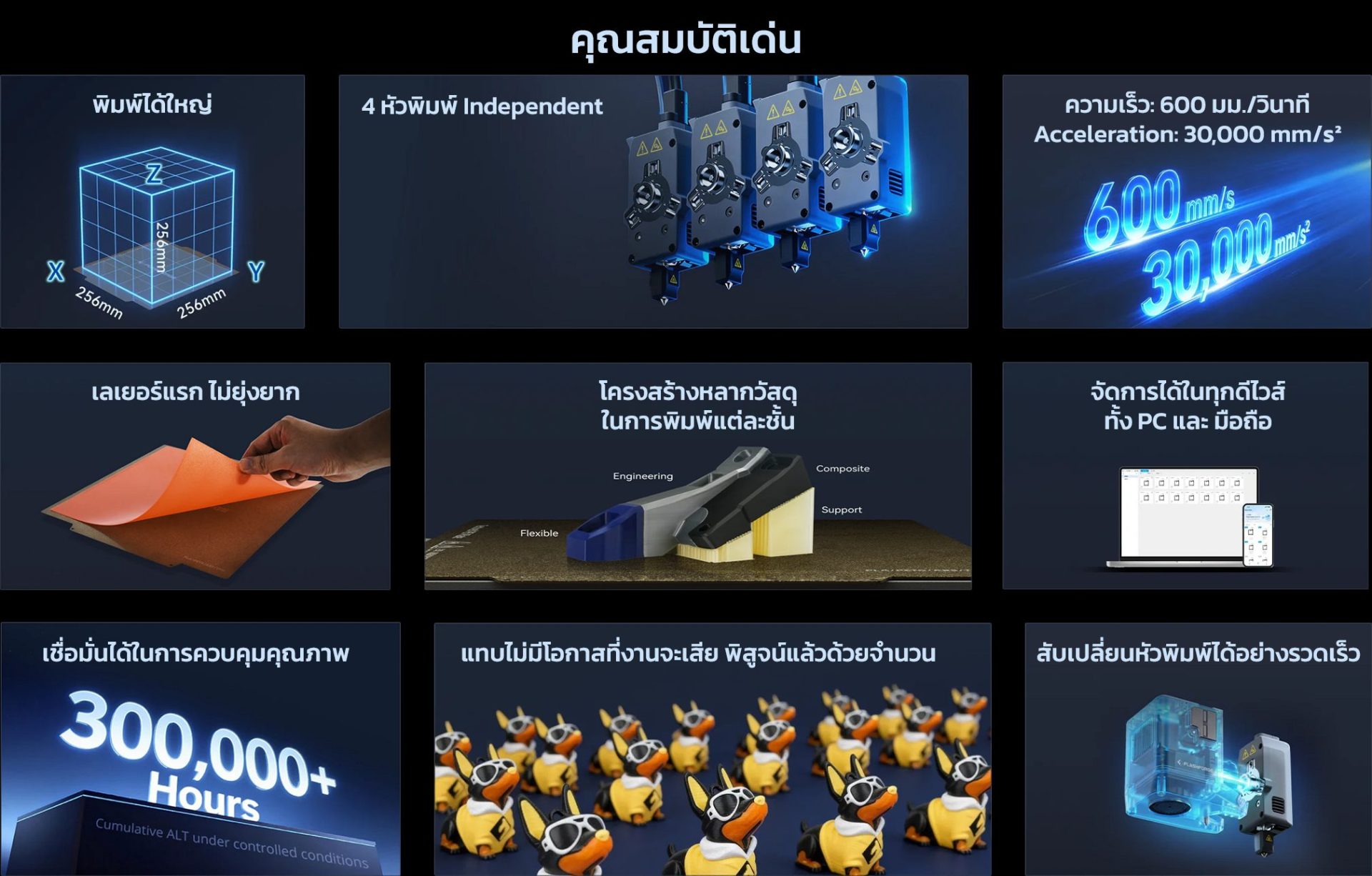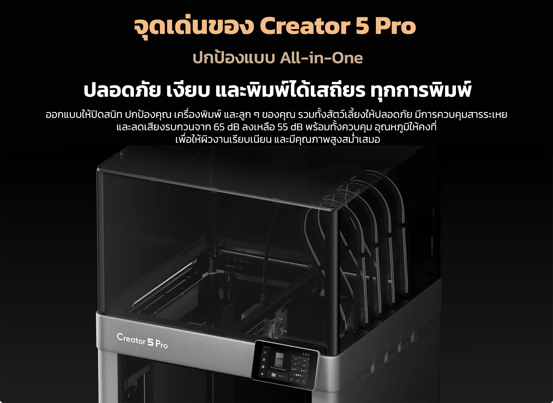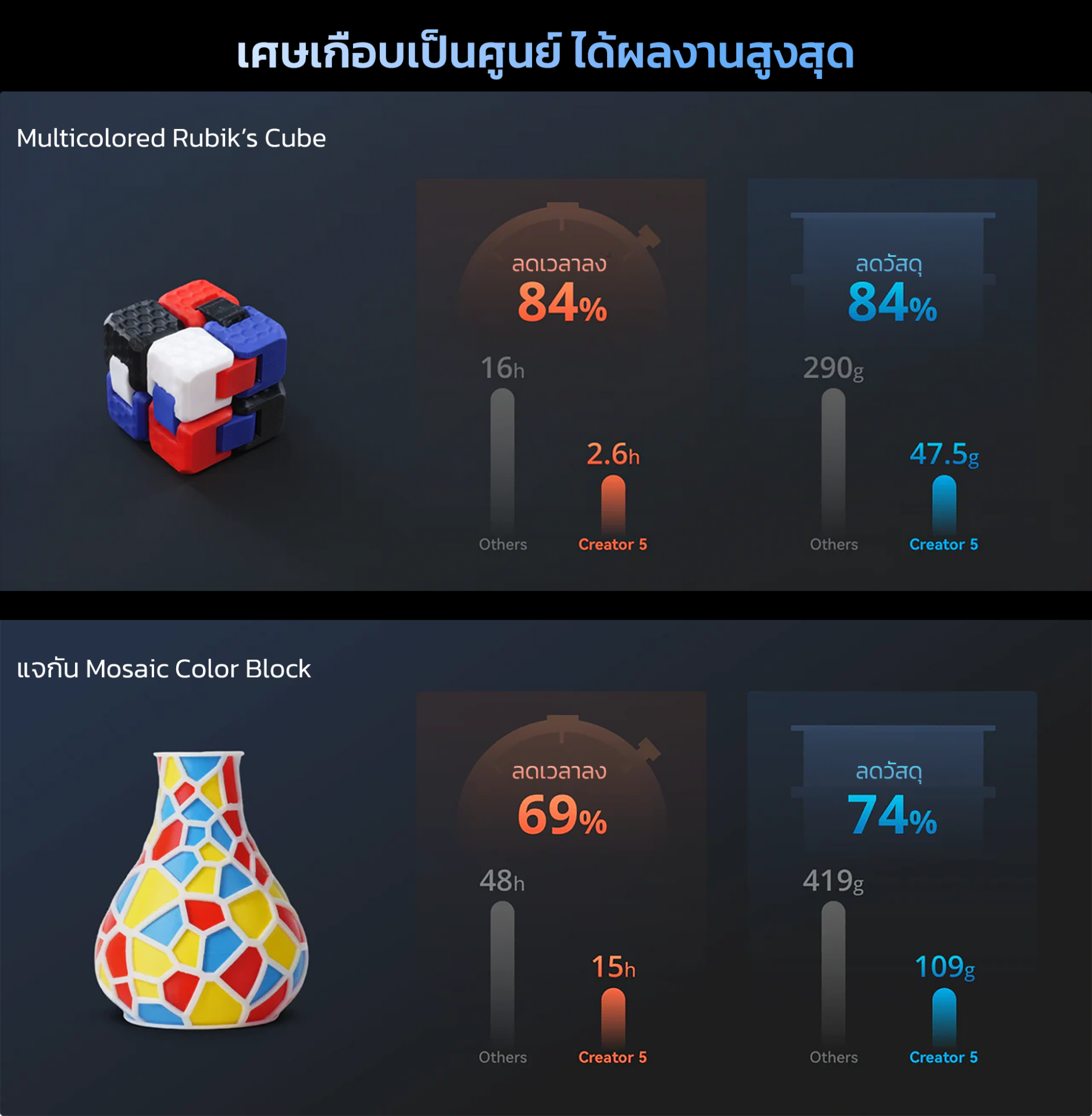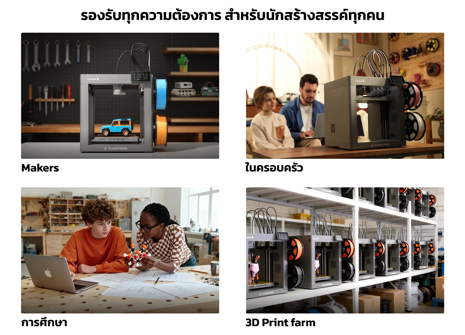 Flashforge Creator 5 Pro เป็นเครื่องพิมพ์ 3 มิติความเร็วสูง 4 หัวพิมพ์ ที่มาพร้อม ระบบเปลี่ยนหัวพิมพ์ FlashSwapTM ออกแบบมาสำหรับการพิมพ์หลายสี และหลายวัสดุโดยมีเศษพลาสติกเกือบเป็นศูนย์ แตกต่างจากระบบแบบ AMS ที่ใช้หัวฉีดร่วมกันเพียงหัวเดียว ทำให้ต้องฉีดพลาสติกทิ้งเป็นจำนวนมาก ระบบเปลี่ยนหัวพิมพ์ที่แท้จริงนี้ มีหัวพิมพ์อิสระสี่หัวทำให้ไม่ต้องเสียเนื้อที่สำหรับช่องขนาดใหญ่เพื่อทิ้งเศษพลาสติกอีกด้วย