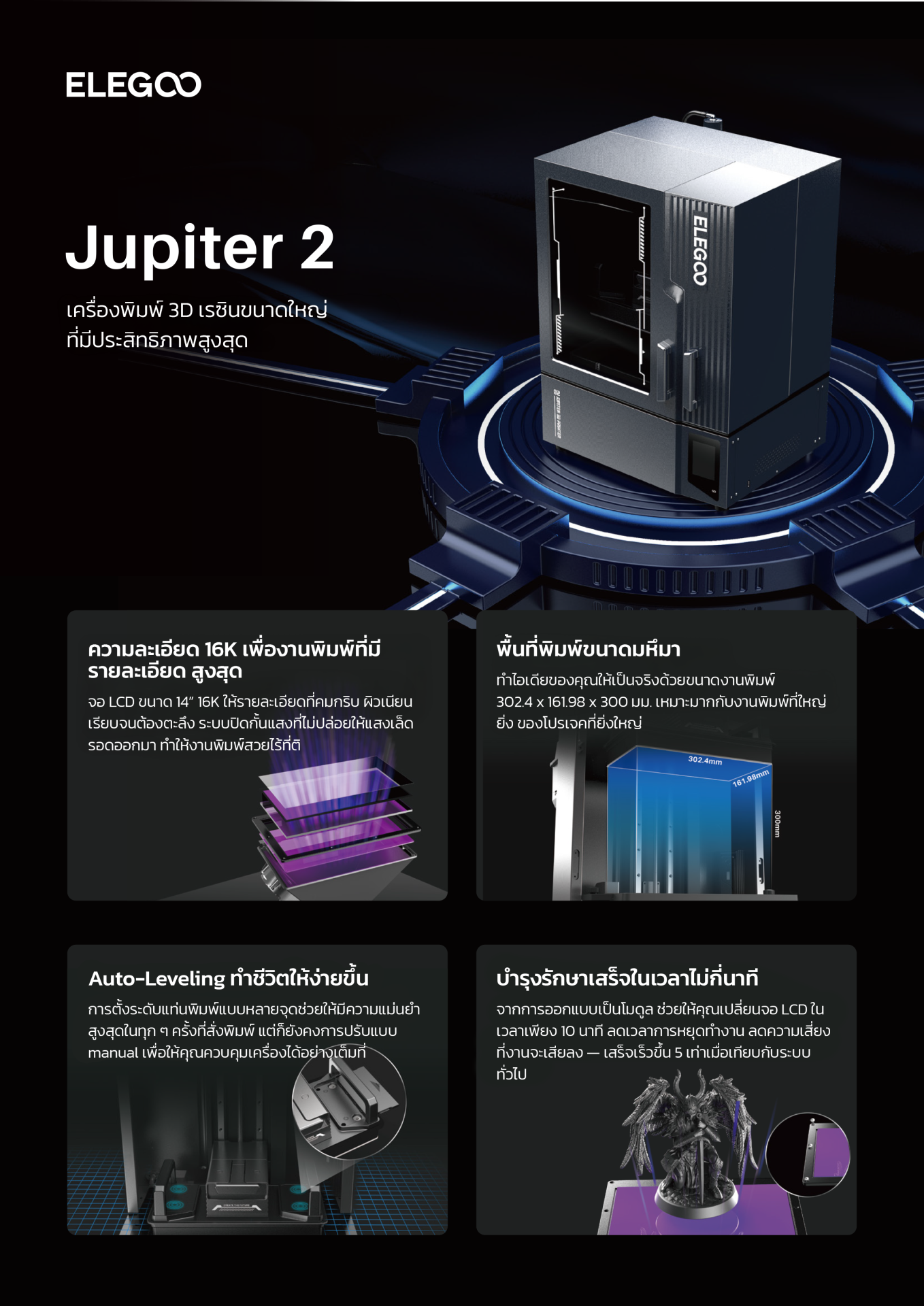 เครื่องพิมพ์ 3 มิติเรซินขนาดใหญ่ Elegoo Jupiter 2 มีจอ LCD ขาวดำความละเอียดสูงพิเศษ ขนาด 14 นิ้ว 16K ให้รายละเอียดคมชัดด้วย ความละเอียด XY ที่น่าประทับใจถึง 20 × 26 µm ผลลัพธ์ที่ได้คือ โมเดลที่คมชัด และพื้นผิวเรียบเนียนสวยงาม ทำให้เครื่องพิมพ์นี้เหมาะสำหรับงานที่ต้องการความแม่นยำเป็นอย่างยิ่ง