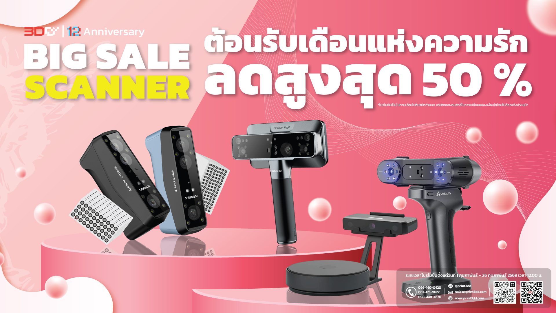 โปรโมชั่นต้อนรับเดือนกุมภาพันธ์ เดือนแห่งความรัก พร้อมจัดเต็มลดราคาสินค้าสแกนเนอร์ 3 มิติ ลดสูงสุด 50% พร้อมของแถมอีกเพียบ สามารถติดต่อผ่านช่องทางออนไลน์ หรือ เข้ามาดูสินค้าจริงที่หน้าร้าน 3DD ได้เลย ร้านเปิดทุกวันจันทร์ – เสาร์ เวลา 8.00 – 17.30 น. รีบหน่อยนะสินค้ามีจำนวนจำกัด หมดแล้วหมดเลย
