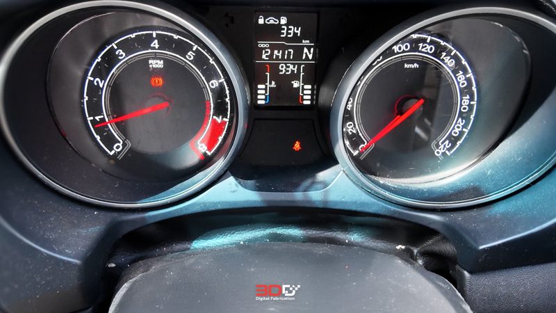 ผมสอดหัวสแกนเข้าไปด้านหลังพวงมาลัย เพื่อเก็บรายละเอียดบริเวณหน้าปัดเรือนไมล์ โดยสแกนเฉพาะส่วนที่ต้องใช้สำหรับออกแบบที่วางมือถือ พอให้ได้โครงสร้างและรูปทรงหลัก ๆ โดยจะสแกน