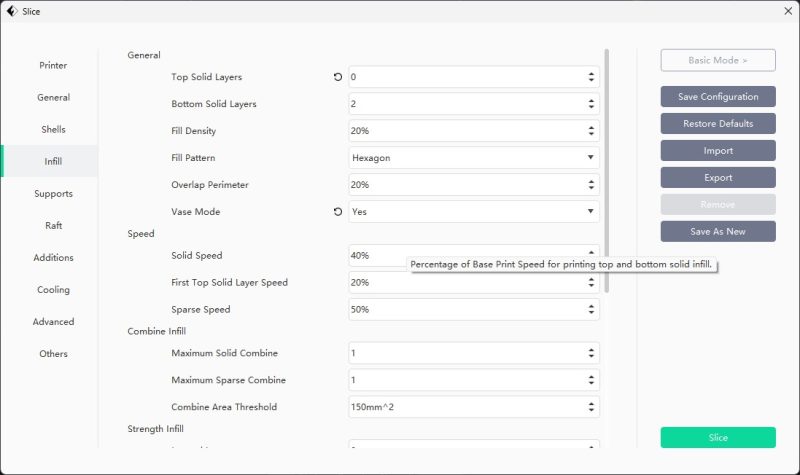 ในฟังก์ชัน Infill ให้ปรับ Vase Mode เป็น Yes โดยที่ไม่ได้ปรับอะไรเพิ่มเติม เมื่อเรียบร้อยแล้วให้คลิกที่ Slice