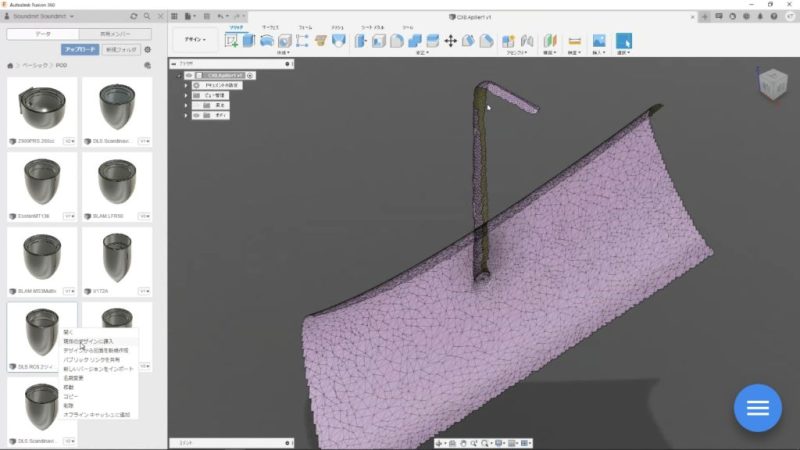 ข้อมูลพื้นผิวโค้งของเสา A CX-8 ที่สแกนจะถูกแทรกลงใน Fusion360 โดยใช้ “Insert Mesh”