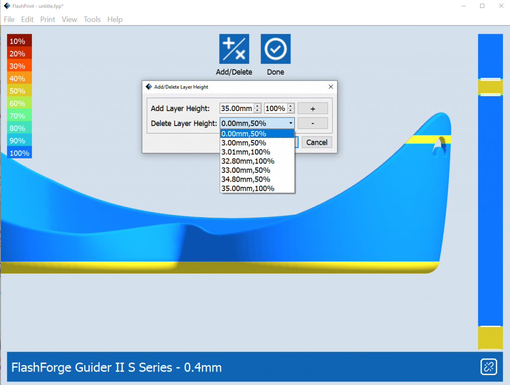 สามารถกดปุ่ม +/X เพื่อกำหนดตำแหน่ง เช่นกำหนดที่ 3.0 มม. ให้ลดความสูงเลเยอร์ลง 50% หากเราตั้งค่ามาตรฐานไว้ที่ 0.2 มม. ก็จะเหลือ 0.1 มม. หรืออาจกำหนดโดยใช้เมาส์ลากไปตามแท่งสีน้ำเงินด้านขวา แล้วคลิกเม้าส์ปุ่มขวาเพื่อระบุตำแหน่งก็ได้