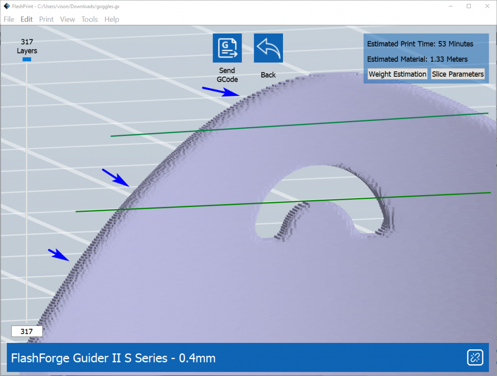 สามารถกำหนดได้หลายตำแหน่ง ตามต้องการ เมื่อกำหนดเรียบร้อยแล้วก็กดปุ่ม Done แล้วกลับไปตั้งค่าอื่น ๆ ต่อไป - เมื่อลอง slice ดูจะเห็นเลยว่าเลเยอร์จะมีความสูงต่างกันตามที่ตั้งค่าไว้ ตามที่ลูกศรชี้