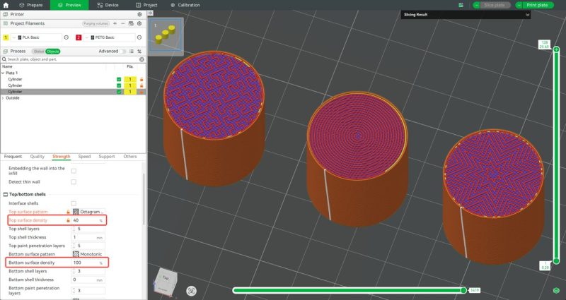ผิวบน และล่างของโมเดลไม่จำเป็นต้องปิดเรียบอีกแล้ว สามารถใส่ลวดลายของ infill บนผิวงานได้ โดยกำหนดความถี่ตาม % ของ infill ช่วยให้มีความสวยงาม มีสไตล์ และดูสร้างสรรค์