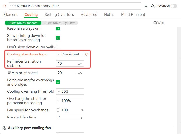 • Consistent Surface: เมื่อเปิดใช้งาน ความเร็วจะลดลงในส่วนของ infill และที่ผนังด้านนอกเมื่อจำเป็น คำสั่งนี้จะช่วยเพิ่มความเสถียรของผิวหน้า โดยเฉพาะอย่างยิ่งกับวัสดุที่มีผิวเงา หรือ silk