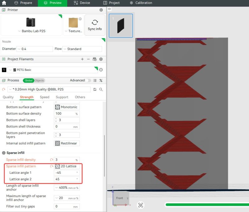 เพิ่มรูปแบบ 2D Lattice infill ซึ่งเหมาะกับโครงสร้างน้ำหนักเบา เช่นปีกเครื่องบิน จะมีตัวเลือก 2 ตัว กำหนดมุมของ infill