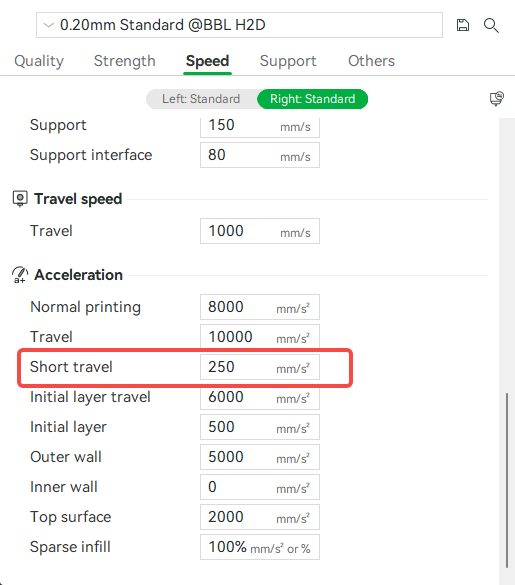 • Short Travel Acceleration: ปรับตัวเลขที่จุดนี้เพื่อลดการกระชากในการย้ายจุดในช่วงสั้น ๆ ที่ผิวด้านนอก ช่วยลดรอยตำหนิที่เกิดจากอัตราเร่ง และลดการเร่งในช่วงสั้น ๆ ค่าเริ่มต้นอยู่ที่ 250 mm/s² เป็นคำสั่งแบบ global