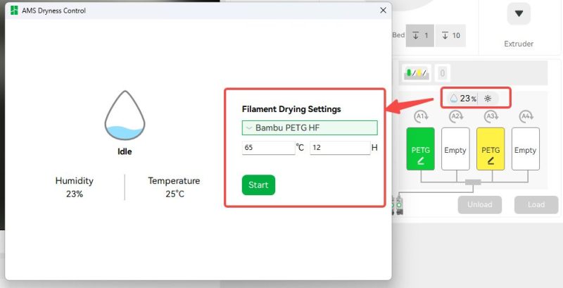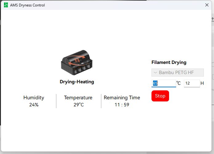 • คลิกปุ่มบอกความชื้น (humidity) ที่เครื่อง AMS ที่ต้องการอบ จะมีหน้าต่างแสดงการควบคุมการอบเส้น สามารถกดริ่ม หรือหยุดได้เลย