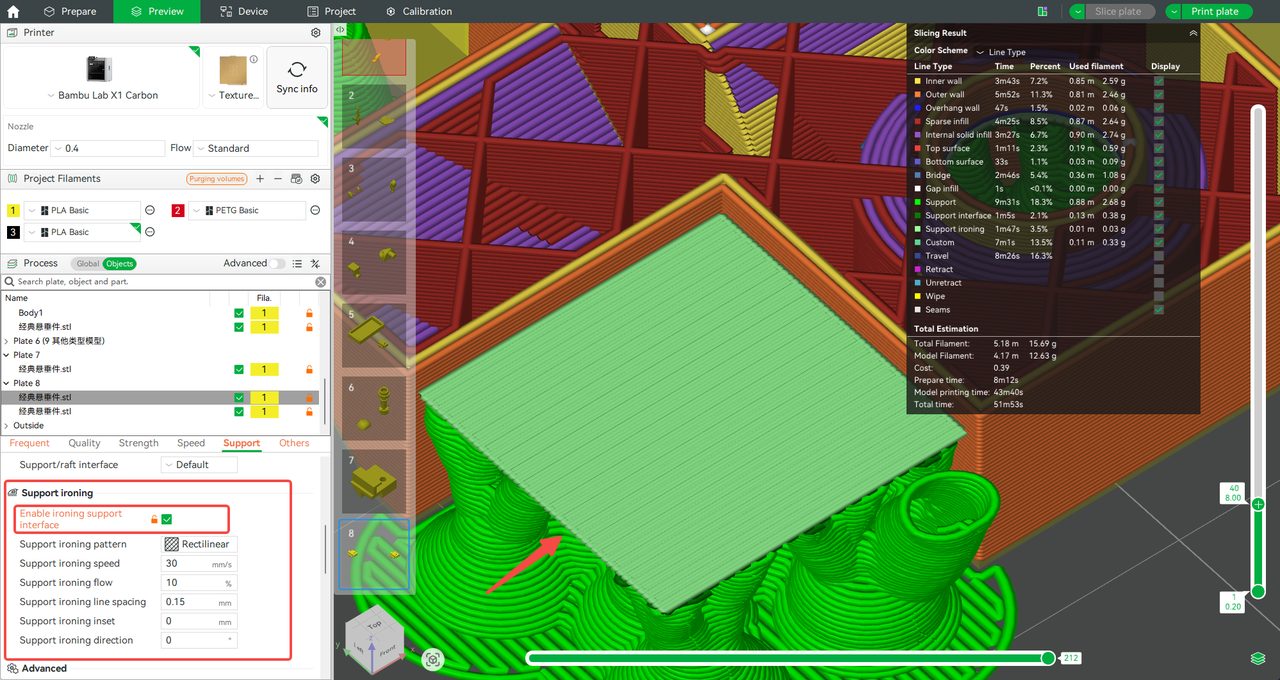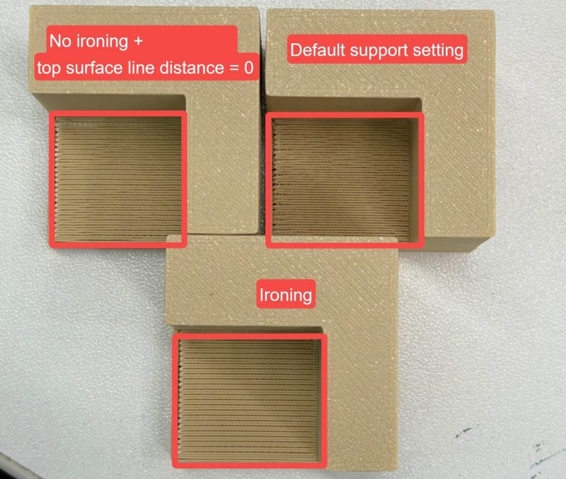 ฟีเจอร์ที่แนะนำเพิ่มเติมใน Bambu Studio คือการทำ ironing สำหรับ support interfaces เมื่อพิมพ์ support ด้วยวัสดุเดียวกับชิ้นงาน ฟีเจอร์นี้จะช่วยให้ผิวงานช่วงที่มี support จะดีขึ้น