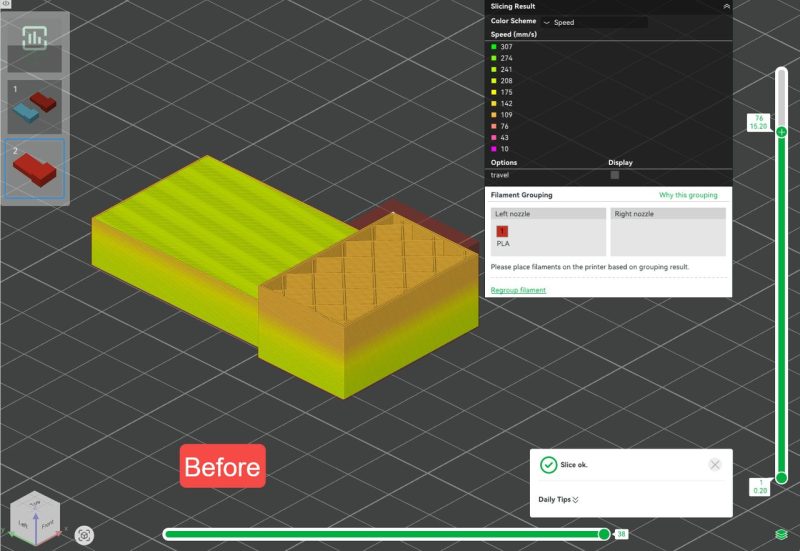• เมื่อเปิดไฟล์ 3MF เก่าที่มีการปรับเปลี่ยนข้อมูล “Top Surface Flow Ratio” ข้อมูลนั้นจะถูกกำหนดให้อยู่กับหัวฉีดด้านซ้าย ส่วนหัวฉีดด้านขวาต้องกำหนดใหม่ด้วยตัวเอง