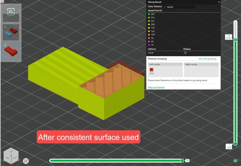 • Consistent Surface: เมื่อเปิดใช้งาน ความเร็วจะลดลงในส่วนของ infill และที่ผนังด้านนอกเมื่อจำเป็น คำสั่งนี้จะช่วยเพิ่มความเสถียรของผิวหน้า โดยเฉพาะอย่างยิ่งกับวัสดุที่มีผิวเงา หรือ silk